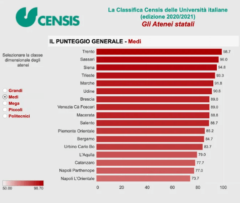 L’Università di Siena si piazza al terzo posto della classifica Censis 2020-2021 degli atenei italiani, fra quelli di medie dimensioni (da 10.000 a 20.000 iscritti), perdendo una posizione rispetto al 2019. Davanti all’università senese, si classificano Trento e Sassari.