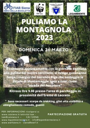 La giornata “Puliamo la Montagnola” è organizzata dal Cai insieme a Legambiente, Wwf e Amici della bicicletta, con il patrocinio del Comune.