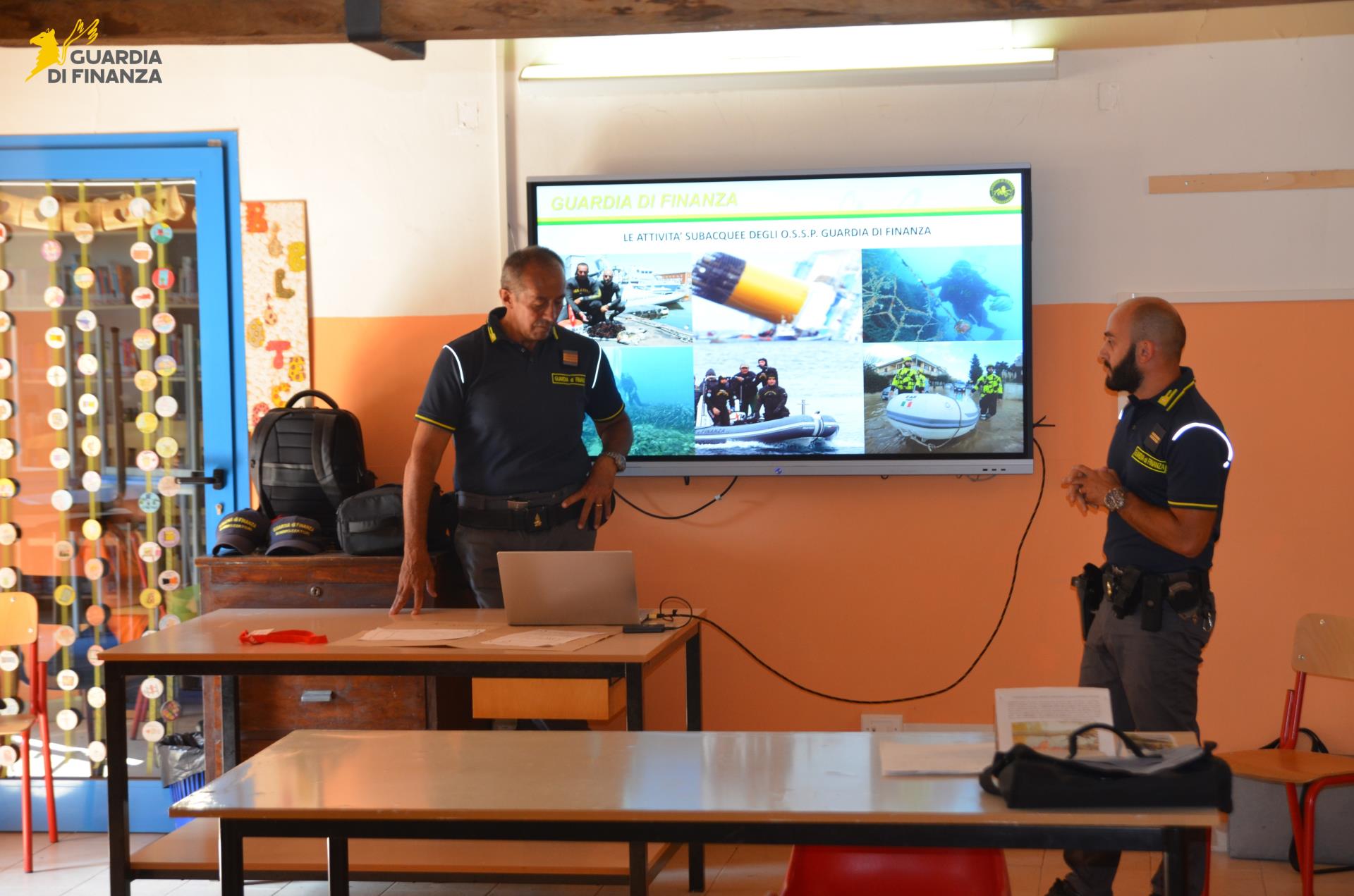 Alla presenza del Tenente Michele DE NICOLA, Comandante della Tenenza di Poggibonsi, i finanzieri del nucleo sommozzatori della Stazione navale di Livorno hanno raccontato ai giovani il loro servizio quotidiano e come la Guardia di Finanza, unica forza di polizia operante sul mare a garanzia dell’ordine e della sicurezza pubblica, nello svolgimento dei compiti istituzionali sia spesso impegnata in operazioni di ricerca e soccorso in mare e in altre attività a salvaguardia della vita umana in occasione di calamità e disastri, a supporto del Dipartimento nazionale della protezione civile. Ai giovani sono stati quindi mostrati alcuni video realizzati in occasione degli eventi calamitosi causati dalle piogge persistenti che, nel novembre 2023, hanno provocato alluvioni e dissesti idrogeologici nelle province di Firenze e Prato, ove sono intervenuti i finanzieri specializzati “operatore subacqueo servizio di polizia”, coordinati dal Centro crisi emergenziale interforze del Corpo nazionale dei Vigili del Fuoco e dall’Unità di crisi locale. Anche in relazione a tali eventi, nel 2024 la Regione Toscana ha attribuito il “Pegaso d’oro” al Comando regionale della Guardia di Finanza, per il senso del dovere, la solidarietà e lo spirito di sacrificio dimostrato dai finanzieri del Reparto Operativo Aeronavale impegnati nel soccorso alle popolazioni toscane duramente colpite dai gravi eventi meteorologici.