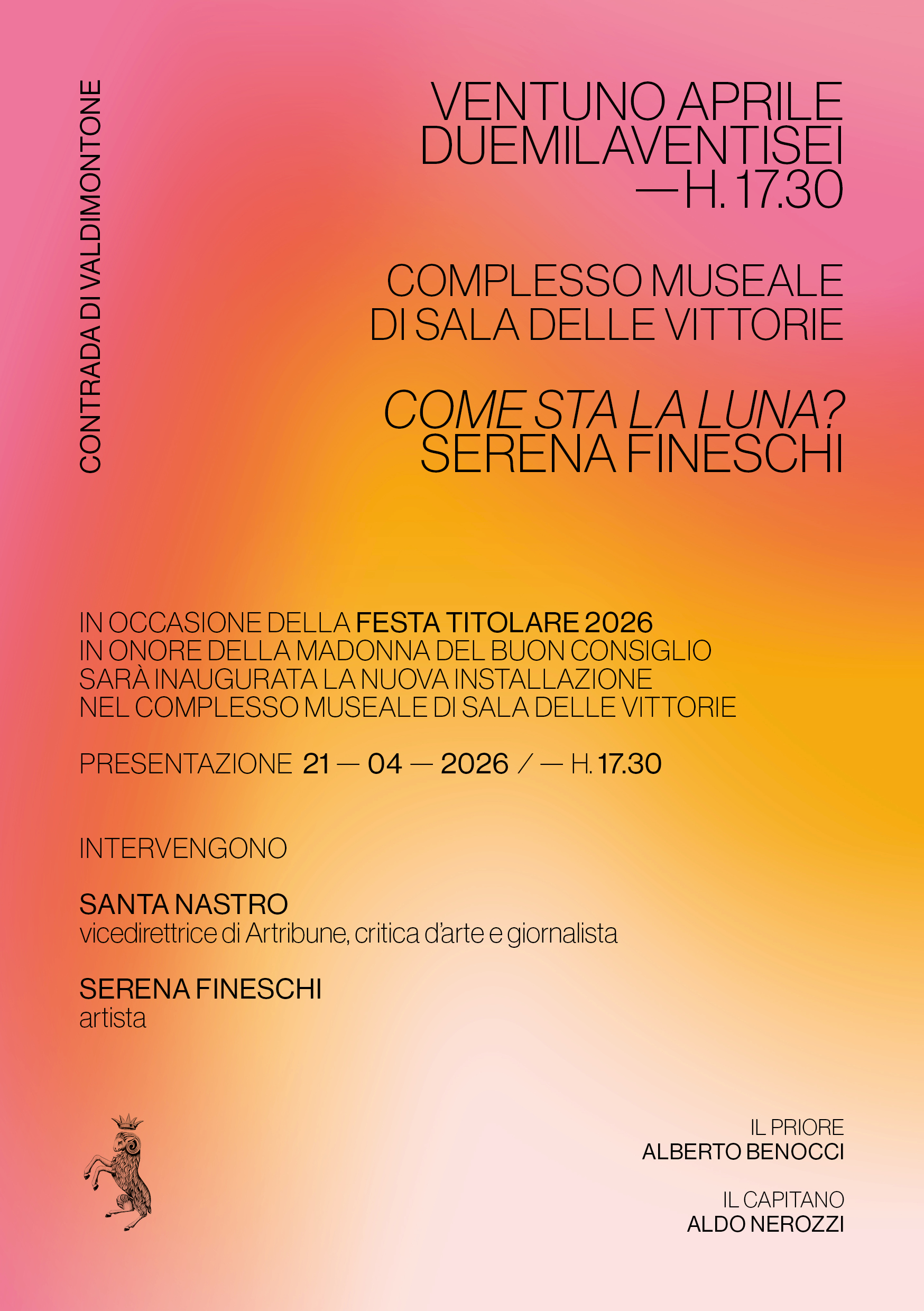 Con questa installazione, la Contrada di Valdimontone conferma la volontà di essere non solo custode della tradizione, ma anche luogo di produzione culturale viva, dove l’arte contemporanea diventa parte integrante della propria identità.