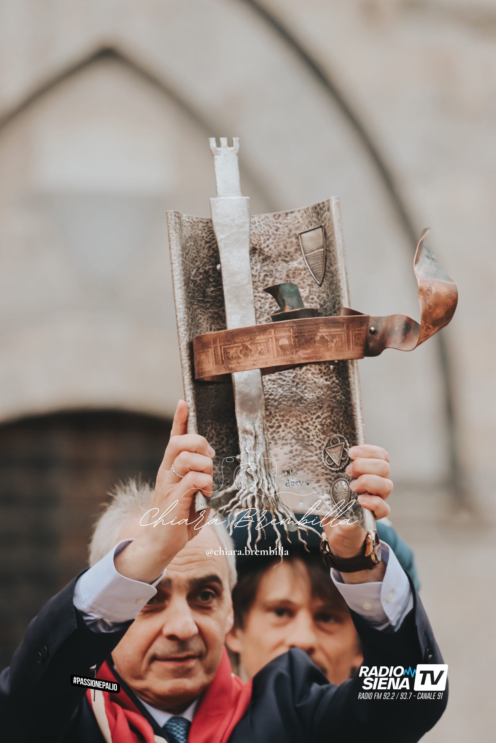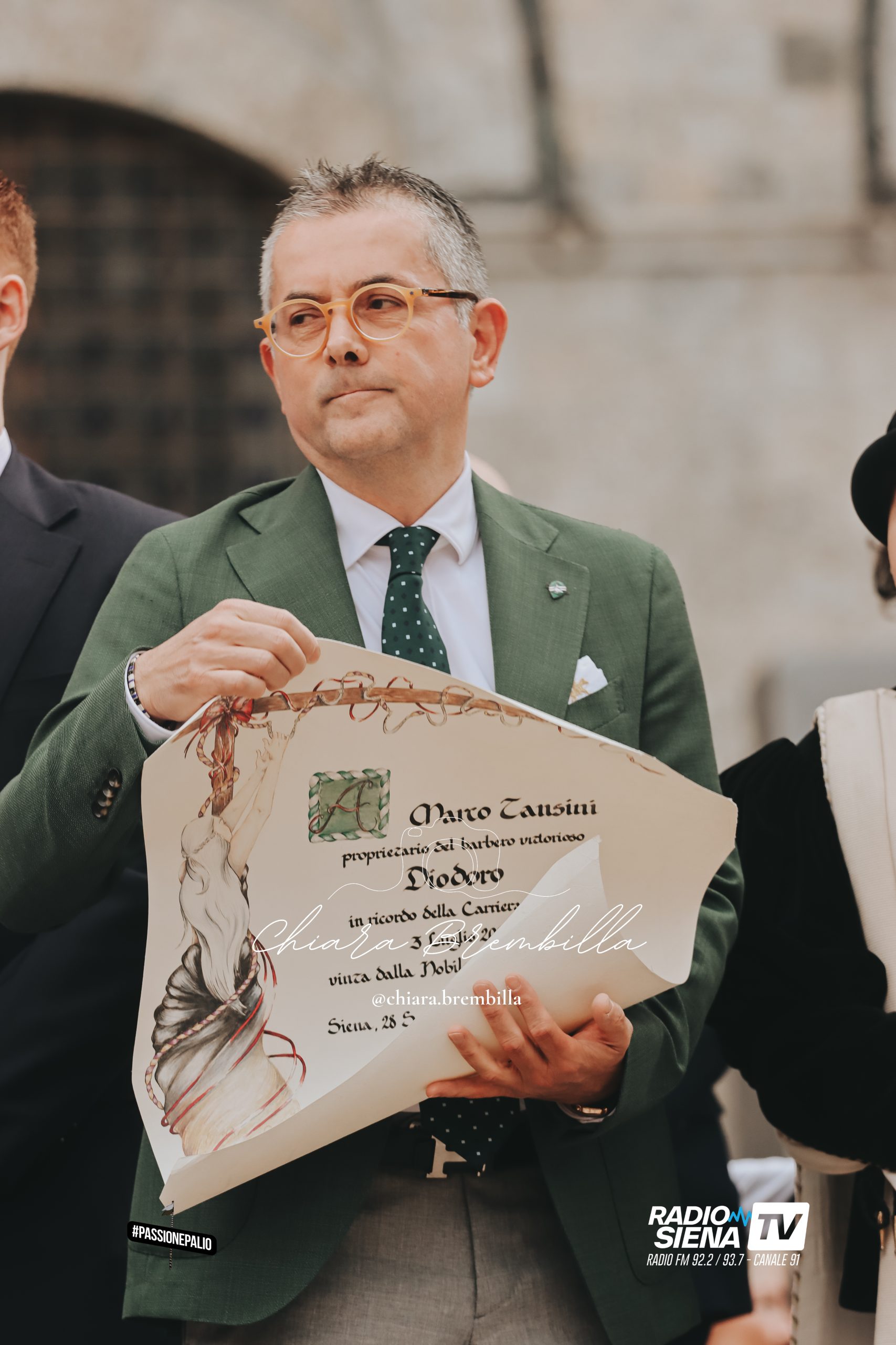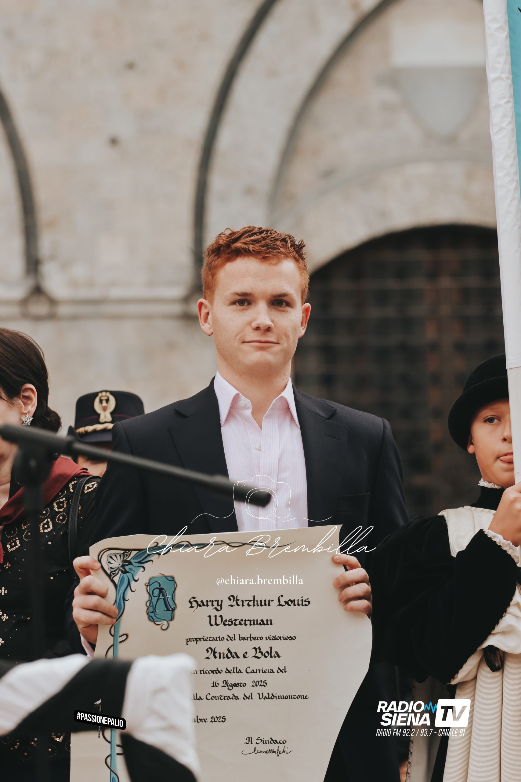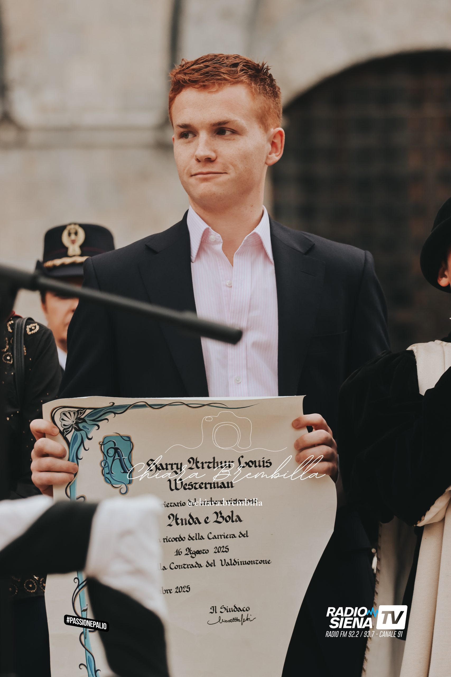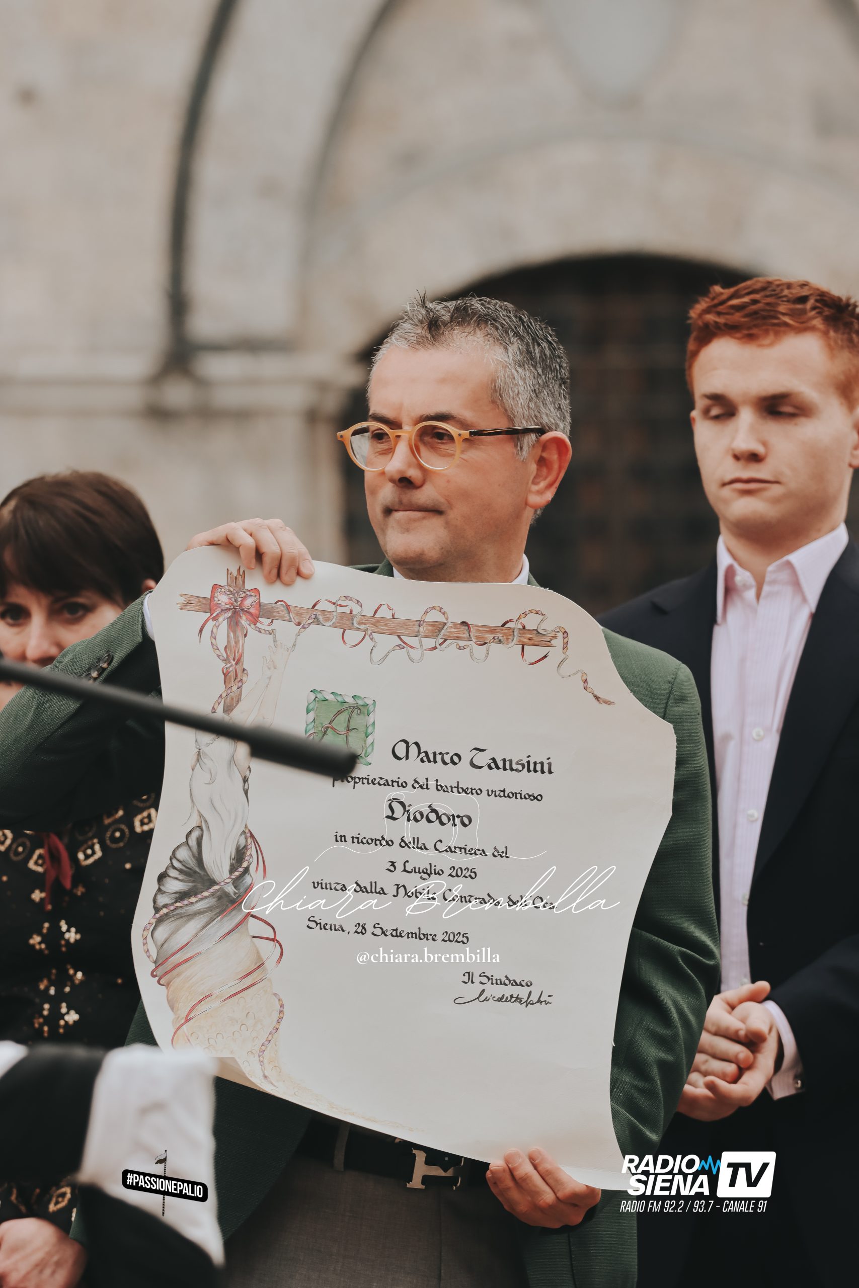 Durante l’evento sono stati consegnati anche i “bandierini” ai proprietari dei cavalli vincitori dei Palii del 2025: Marco Tansini, proprietario di Diodoro, che ha vinto all’esordio sul tufo il Palio del 3 luglio per la Nobile Contrada dell’Oca, montato da Giovanni Atzeni detto Tittia e Harry Arthur Louis Westerman, proprietario di Anda e Bola, castrone baio di nove anni che, alla sua terza esperienza in Piazza, ha trionfato nella carriera di agosto per la Contrada del Valdimontone, montato da Giuseppe Zedde detto Gingillo.