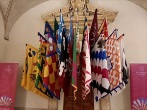 Momenti suggestivi questo pomeriggio nel cortile del palazzo del Rettorato dell’Università di Siena per la consegna all’Ateneo delle bandiere delle 17 Contrade. I Priori delle Contrade, alla presenza del Rettore del Magistrato delle Contrade Emanuele Squarci, hanno consegnato all’Ateneo le bandiere, che adesso saranno nella disponibilità dell’Ateneo e andranno a impreziosire la sede centrale.