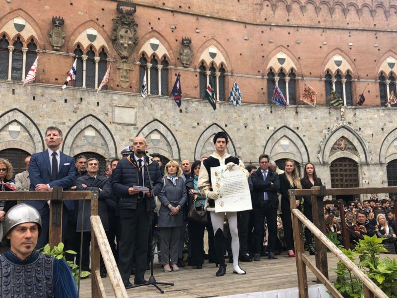 È stato consegnato il Masgalano del Palio straordinario 2018, realizzato da Sara Cafarelli, alla Contrada Sovrana dell’Istrice. Alla Contrada della Lupa, avendo ottenuto un punteggio uguale a quello della dell’Istrice,è stato consegnato un attestato realizzato da Ester Pittalis, come riconoscimento alla comparsa per essersi contraddistinta nel Campo.
