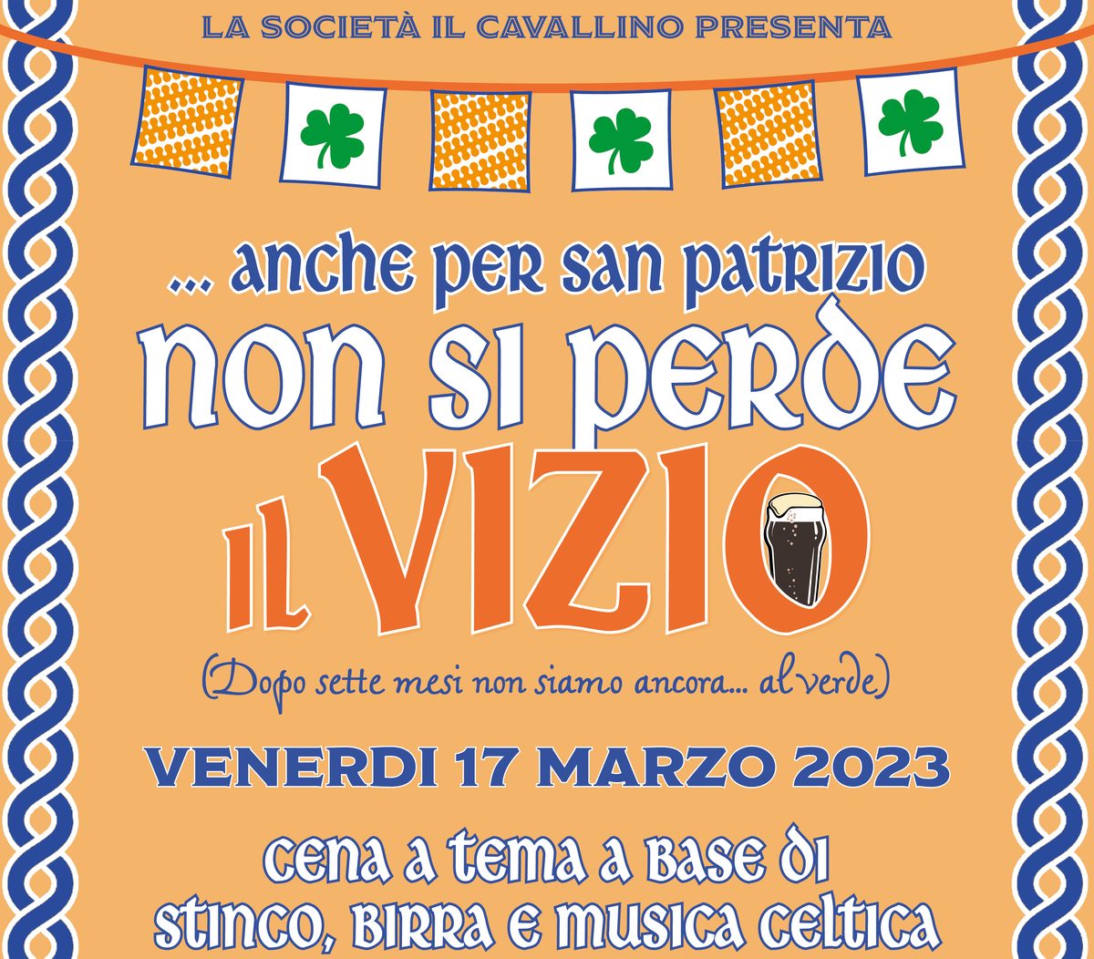La società ‘Il Cavallino’ della Contrada del Leocorno organizza per venerdì 17 marzo, ricorrenza di San Patrizio, una cena a tema a base di stinco, birra e musica celtica. Durante e dopo cena atmosfera da Irish pub