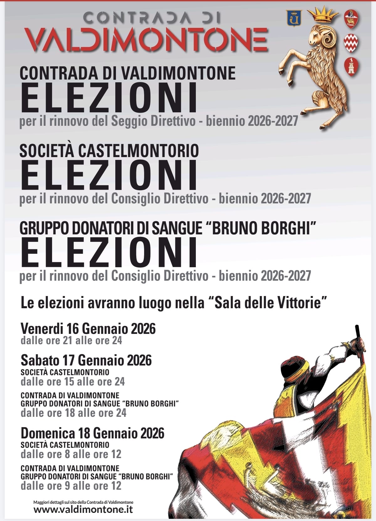 La Contrada del Valdimontone comunica che sono indette nei giorni venerdì 16 gennaio, sabato 17 gennaio e domenica 18 gennaio le elezioni per il rinnovo del Seggio Direttivo della Contrada di Valdimontone biennio 2026/2027, del Consiglio della Società Castelmontorio biennio 2026/2027 e del Consiglio del Gruppo Donatori di Sangue B.Borghi biennio 2026/2027.