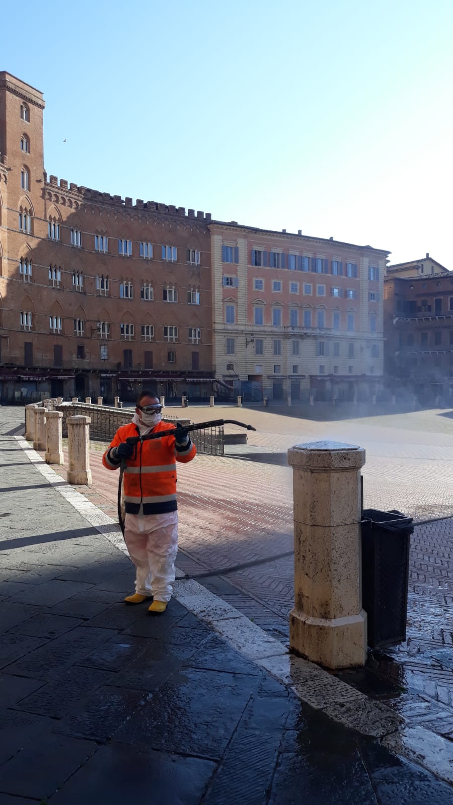 Questa mattina si sono svolte le operazioni di sanificazione e igienizzazione in piazza del Campo a Siena.