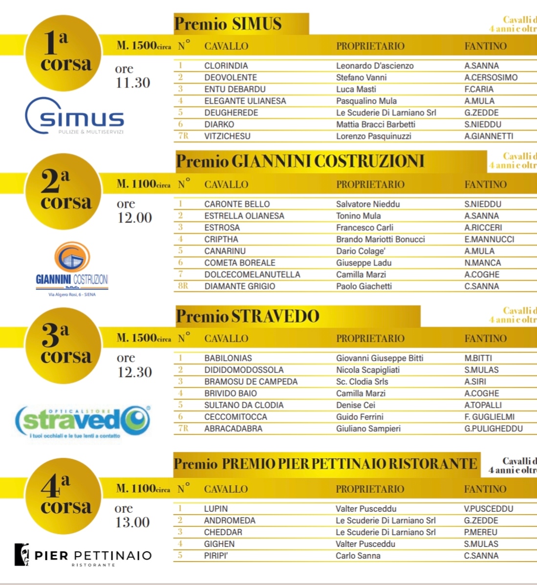 Secondo appuntamento con le corse a pelo a Pian delle Fornaci, domani 16 marzo. Si parte alle 11.30, in programma nove corse, saranno recuperate anche quelle annullate nel precedente appuntamento causa maltempo. Curiosità: si rivedrà a cavallo Alberto Ricceri, detto Salasso, che ha corso l’ultimo Palio il 2 luglio 2018 con l’Istrice montando Trattu de Zamaglia. Il fantino monterà nella seconda corsa Estrosa di Francesco Carli e nella sesta Audace da Clodia di Francesco Giunti.