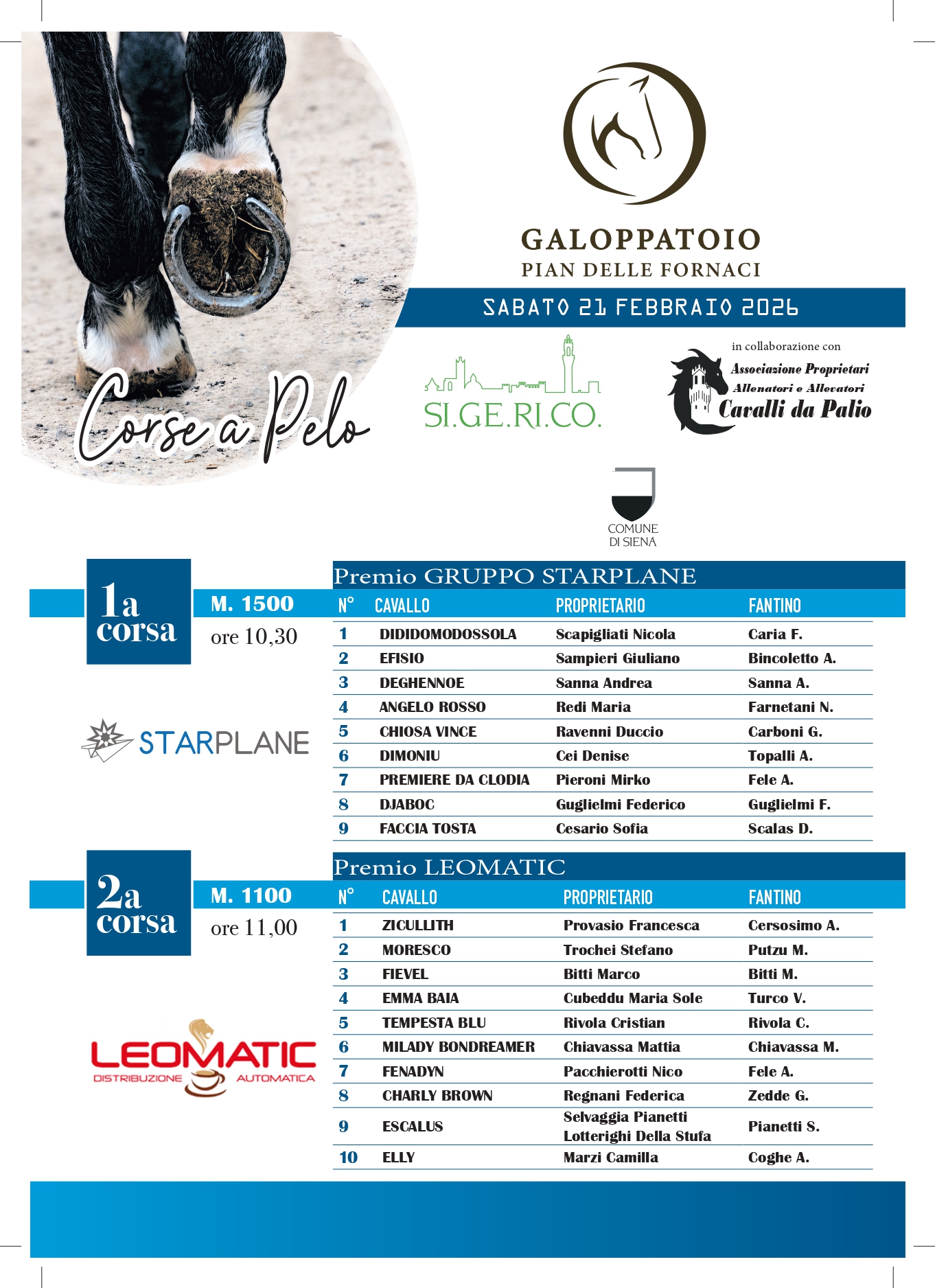 Ecco il programma delle corse che si terranno sabato 21 febbraio presso il Galoppatoio Pian delle Fornaci.