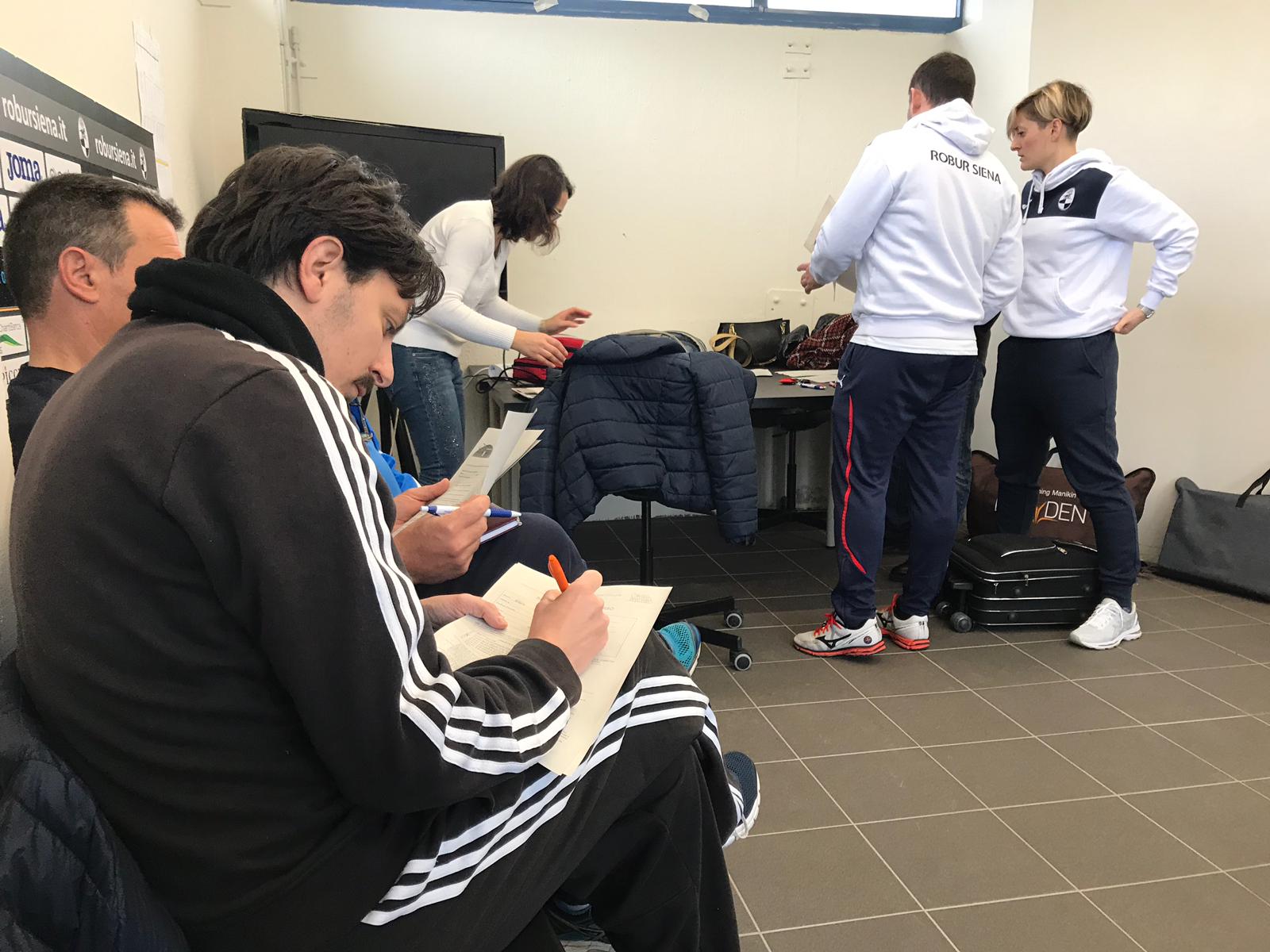 Questa mattina presso l’impianto sportivo dell’Acquacalda si è tenuto il corso BLSD per la Robur Siena, organizzato dall’Associazione Siena Cuore. Hanno preso parte al corso “Basic Life Support – early Defibrillation”, gli staff sanitari bianconeri della prima squadra e del settore giovanile. “Ringraziamo l’Associazione Siena Cuore – afferma il dottor Domenico Di Mambro, responsabile sanitario della Robur Siena – per la collaborazione ed il supporto nella formazione dei nostri staff sanitari. Il corso ci ha illustrato le modalità di intervento con rianimazione cardiopolmonare e defibrillazione per soggetti colpiti da arresto cardiaco. Hanno partecipato al corso anche il team manager e il responsabile del magazzino, oltre che ad un dirigente del settore giovanile, in modo da ampliare le conoscenze anche al di fuori dell’ambito strettamente sanitario”.