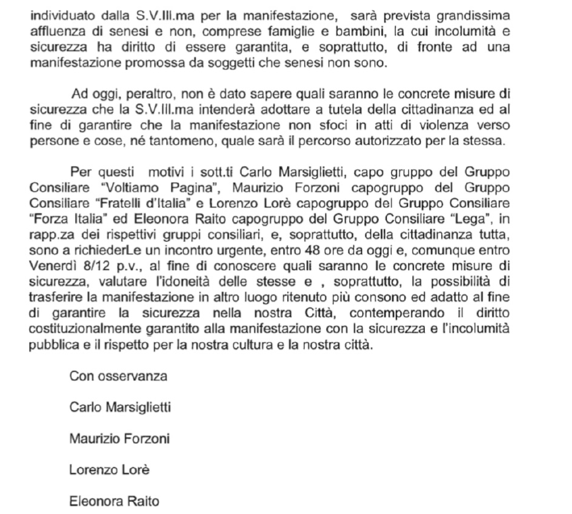 Cresce la fibrillazione a Siena in vista della manifestazione animalista del 9 dicembre. Per questo i capigruppo in Consiglio comunale, Carlo Marsiglietti, Maurizio Forzoni, Lorenzo Lorè ed Eleonora Raito hanno scritto una lettera al Questore Costantino Capuano per chiedere entro 48 ore un incontro, sottolineando le possibili criticità date dalla concomitanza con altri eventi pubblici, e l’assenza, ad oggi, di misure di sicurezza adottate. L’obiettivo è ottenere il trasferimento della manifestazione in un altro luogo.