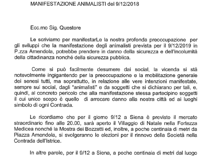 Cresce la fibrillazione a Siena in vista della manifestazione animalista del 9 dicembre. Per questo i capigruppo in Consiglio comunale, Carlo Marsiglietti, Maurizio Forzoni, Lorenzo Lorè ed Eleonora Raito hanno scritto una lettera al Questore Costantino Capuano per chiedere entro 48 ore un incontro, sottolineando le possibili criticità date dalla concomitanza con altri eventi pubblici, e l’assenza, ad oggi, di misure di sicurezza adottate. L’obiettivo è ottenere il trasferimento della manifestazione in un altro luogo.
