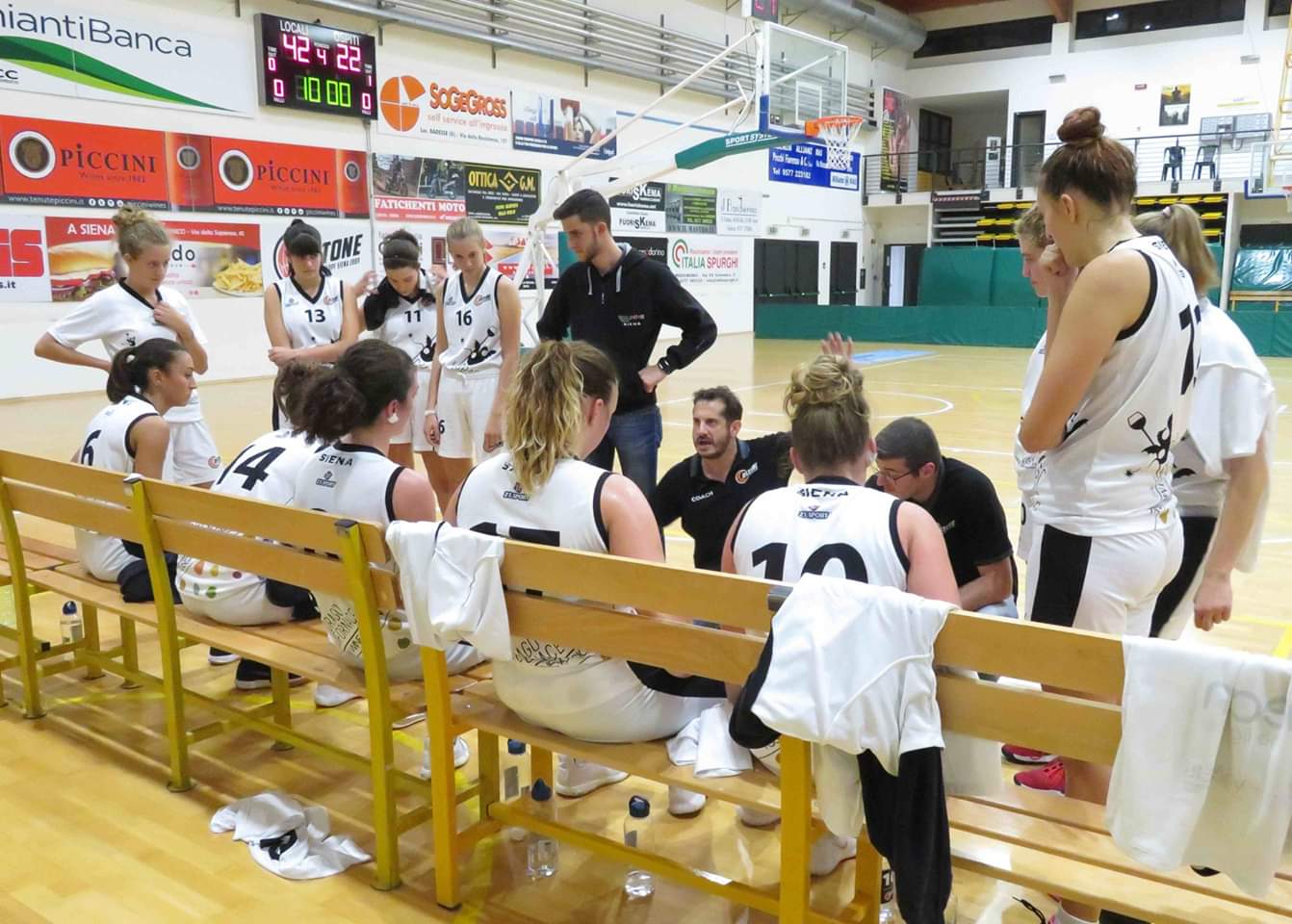 Tutto facile per il Drago e la Fornace che esce con una convincente vittoria dalla prima gara di Campionato, sconfiggendo al PalaNannini la Pallacanestro Perugia per 52-29. Se di equilibrio possiamo parlare, questo è riferito solo alla prima parte della gara, anche se va detto che le senesi hanno sempre avuto il controllo della situazione nelle prime due frazioni di gioco, per poi dilagare a proprio piacimento dopo la pausa lunga. Infatti le ragazze di David Fattorini, una volta rientrate in campo, riescono a scrollarsi definitivamente di dosso le avversarie, imprimendo alla manovra offensiva un ritmo sostenuto che le perugine non riescono a contenere, nonostante gli incitamenti ripetuti del loro tecnico, la campionessa ungherese Katalin Honti che nella sua carriera di cestista ha vinto davvero tutto (1 Eurolega, 1 Coppa di Spagna, 2 Campionati italiani e 2 Coppe Italia, 2 Supercoppe italiane, 6 scudetti ungheresi, 4 coppe di Ungheria, 2 bronzi agli europei U18 e U20). Il + 20 della 3^ sirena in pratica mette fine ai giochi, con l’ultimo quarto che diventa una sorta di buon allenamento per le bianconere, con le seconde linee che si ritagliano brevi minutaggi. Ad onor del vero Perugia non è sembrata poi così irresistibile, ma va dato merito alle senesi di aver fornito una prova più che soddisfacente, soprattutto in difesa, dove sono stati concessi solo 29 punti alle perugine, 4 nella 3^ e decisiva frazione.