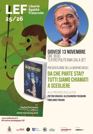 Giovedì 13 novembre, alle ore 18, nella Sala Set del Teatro Politeama, sarà presentato il volume pubblicato da Tunué, “Da che parte stai? Tutti siamo chiamati a scegliere”, ispirato alla storia di Pietro Grasso, ex magistrato, Procuratore nazionale antimafia ed ex Presidente del Senato. Con lui saranno a Poggibonsi due tra i tre autori della graphic novel, lo sceneggiatore Emiliano Pagani, con Alessio Pasquini. Sarà assente invece l’illustratore Loris De Marco.