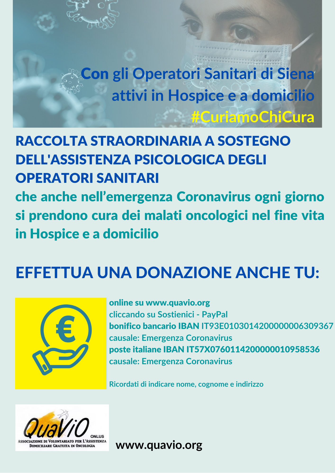 #CuriamoChiCura è accanto agli operatori sanitari di Siena attivi in Hospice e a domicilio garantendo il supporto psicologico a medici, infermieri e personale non sanitario che si dedicano, ogni giorno, alla cura dei malati oncologici nel fine vita: obiettivo finale è offrire supporto contro ansia, angoscia e paura. Ecco come Quavio, insieme all’Unità Funzionale Cure Palliative dell’Azienda Usl Toscana sud est, sta affrontando l’emergenza COVID-19. Per raggiungere l’’obiettivo è stata attivata una campagna di raccolta fondi.