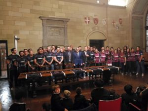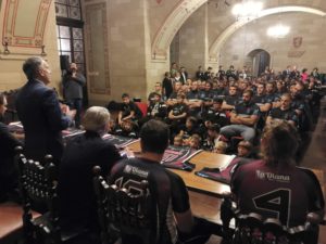 Il sindaco Bruno Valentini ha partecipato alla presentazione delle squadre seniores del Banca Cras Cus Siena Rugby, che si è tenuta a Palazzo Pubblico nella prestigiosa Sala delle Lupe. Un appuntamento che testimonia l’affetto con cui la città segue il cammino della palla ovale senese, un momento istituzionale che ripaga il sacrificio delle giocatrici e dei giocatori del Cus Siena che portano in alto, anno dopo anno, il nome della nostra città.