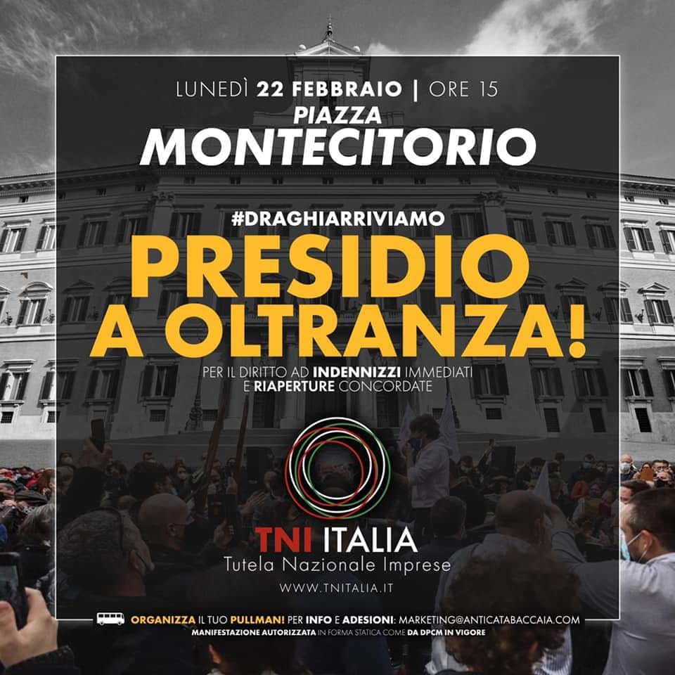 Si terrà da domani, lunedì 22 febbraio alle ore 15, il presidio ad oltranza in Piazza Montecitorio a Roma dei ristoratori aderenti a Ristoratori Toscana che fa parte di Tni (Tutela nazionale imprese) Italia. Provengono da tutta Italia ed è molto numeroso anche il gruppo senese.