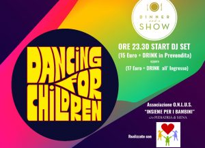 Una serata di beneficenza in favore dell’associazione Insieme per i bambini onlus che da sempre supporta le attività della Pediatria dell’Azienda ospedaliero-universitaria Senese diretta dal professor Salvatore Grosso. Questa l’iniziativa “Dancing for children”, organizzata dagli specializzandi della scuola di specializzazione in Pediatria e in programma sabato 20 aprile alla discoteca Papillon di Monteroni d’Arbia. La serata si svolge con una cena-spettacolo alle ore 21.30 e, successivamente, con ballo e dj-set a partire dalle ore 23.30. Il ricavato sarà finalizzato all’acquisto di strumenti per la cura dei bambini ricoverati all’Aou Senese. Per info e prenotazioni contattare Alessia al 328 7080420 o Giannis al 389 6290731