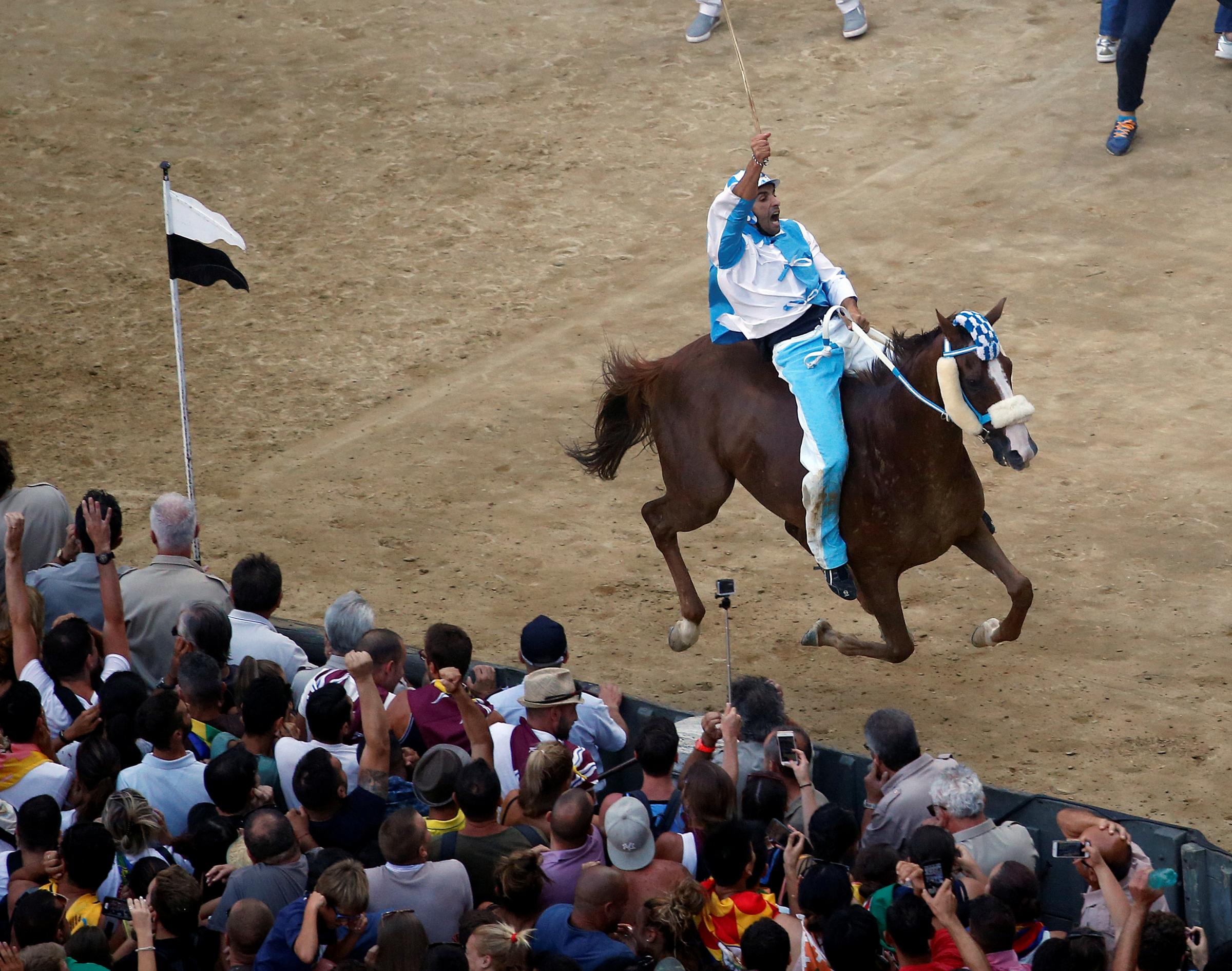 Al Fantino della Nobile Contrada dell’Oca, Valter Pusceddu detto Bighino, così come previsto dall’art. 99 del Regolamento del Palio, l’esclusione, per un Palio, dal montare cavalli di Contrada sia per le prove sia per il Palio, per aver, nella fase della mossa, tenuto un comportamento contrario a quanto disposto dal 1° comma dell’art. 64. Allo stesso fantino, e sempre in base agli stessi articoli del Regolamento, anche un’ammonizione per essere partito, sempre in occasione della Corriera, da posizione diversa rispetto all’ottavo posto assegnatogli. Questa stessa ammonizione, cumulandosi con quella comminata nel 2015, fa scattare automaticamente l’esclusione, per un Palio, dal montare cavalli di Contrada sia per le prove sia per il Palio.