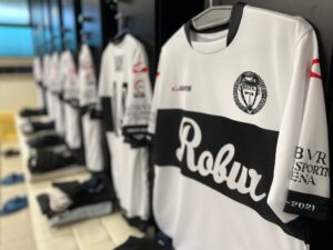 Il Siena celebra oggi l’anniversario numero 117 della fondazione del club con una maglia da gioco esclusiva. Non si tratta di una casacca storica della Società di calcio, ma celebrativa, realizzata unicamente per l’occasione e per festeggiare insieme a tutti i tifosi l’evento speciale. Tessuto tecnico, completamente bianca con una barra nera in orizzontale con scritto “Robur” – caratteri tipici in stile Liberty che campeggiavano nelle canotte del gruppo ciclistico agli inizi del ‘900 – è completata con il primo stemma storico, la mano che sostiene in alto un manubrio pesistico. Sulle maniche invece la scritta “Robur Società Sportiva Siena”.