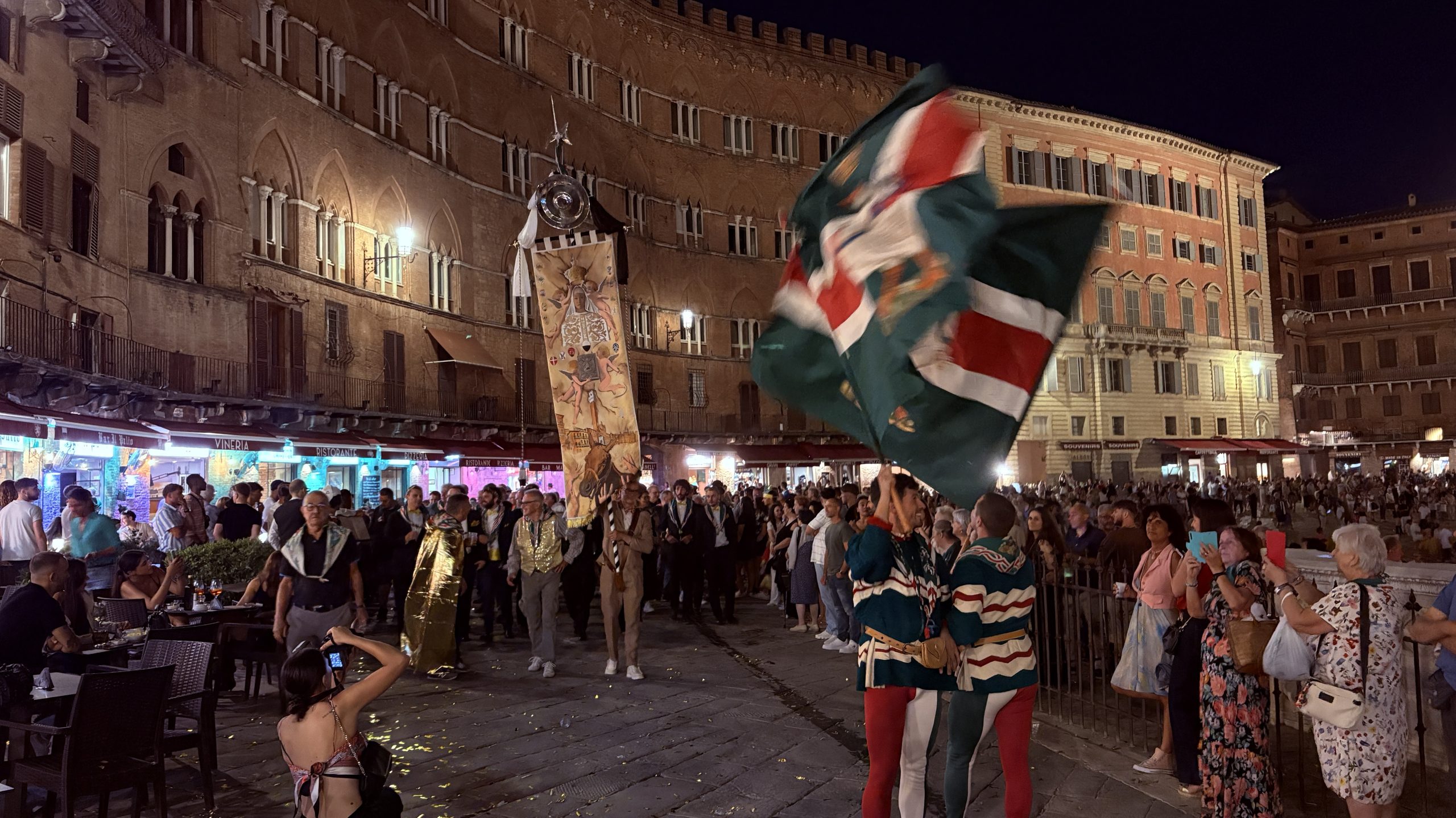 Alle 20.30 circa, dalla Basilica di San Domenico, si è mosso un vero e proprio “corteo-fiume”: oltre 1.200 contradaioli divisi in 35 gruppi, tra carri, bandiere, tamburi, musica e canti, hanno attraversato le vie del centro fino alla Piazza del Campo. In chiusura della carovana, l’immancabile Drappellone firmato da Riccardo Manganelli.