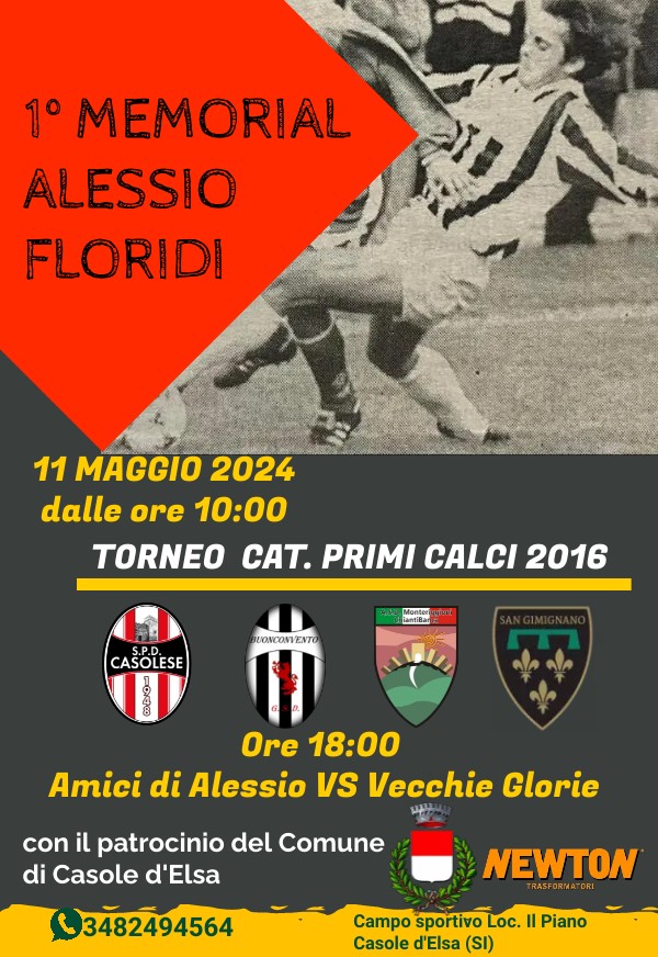 Domani, sabato 11 maggio, all’impianto sportivo comunale del “Piano” di Casole d’Elsa si terrà il primo memorial dedicato al compianto Alessio Floridi, che se ne è andato troppo presto a causa di una lunga malattia qualche settimana fa.