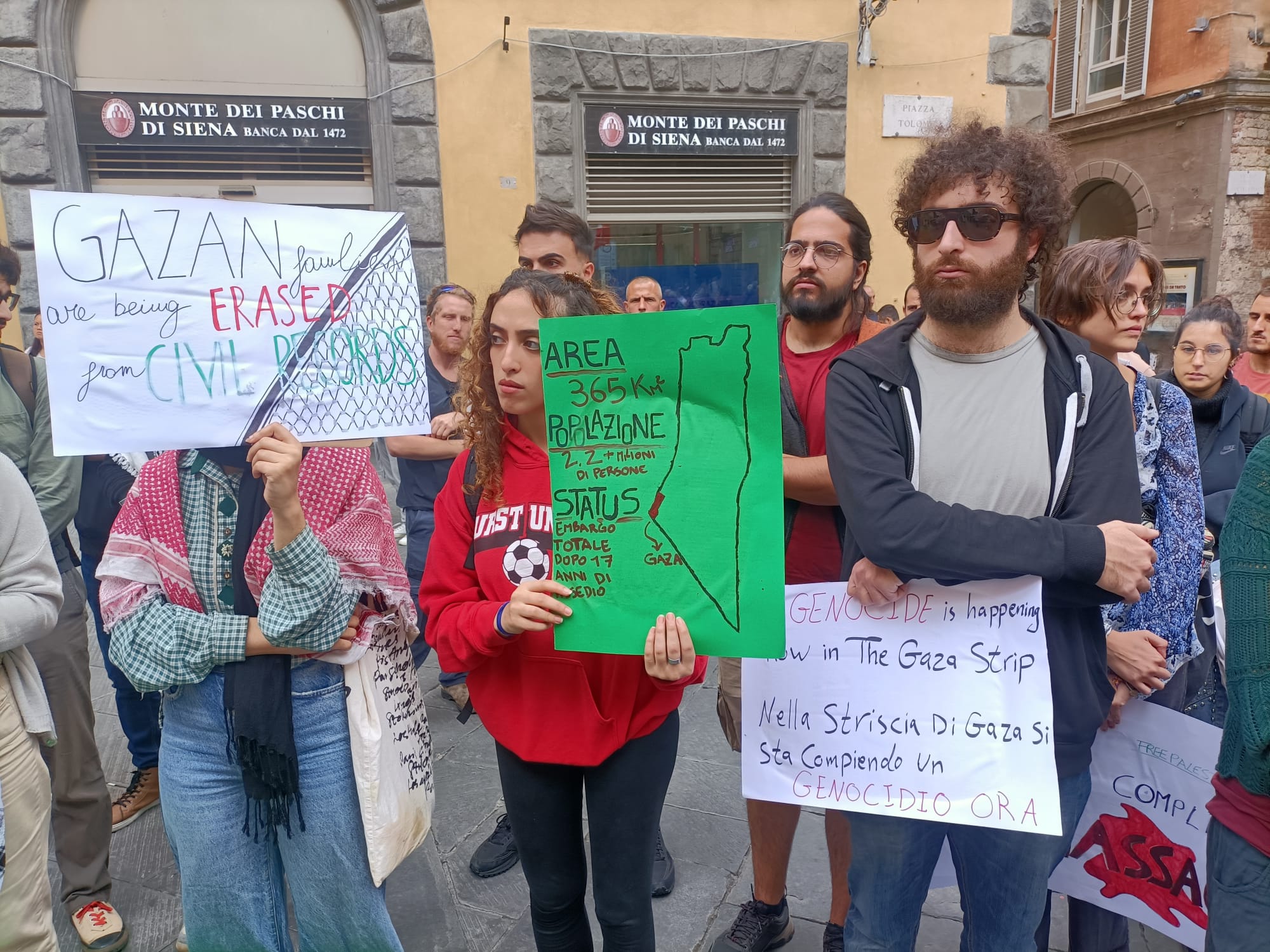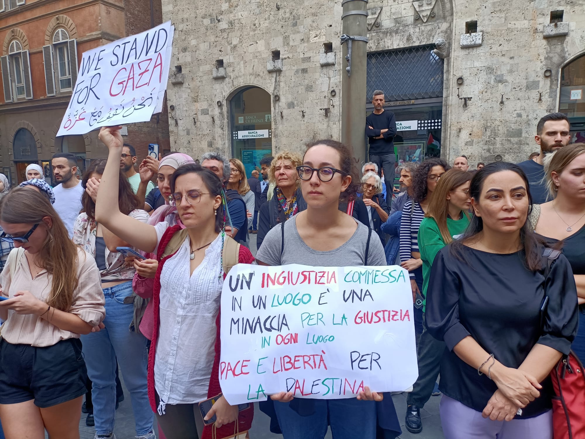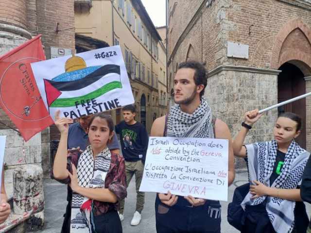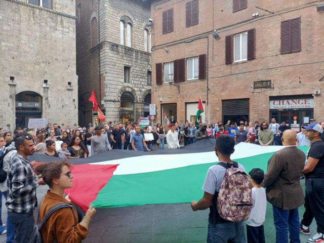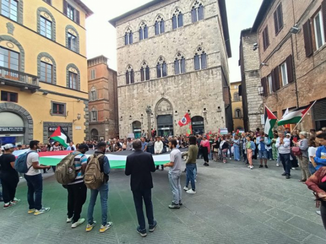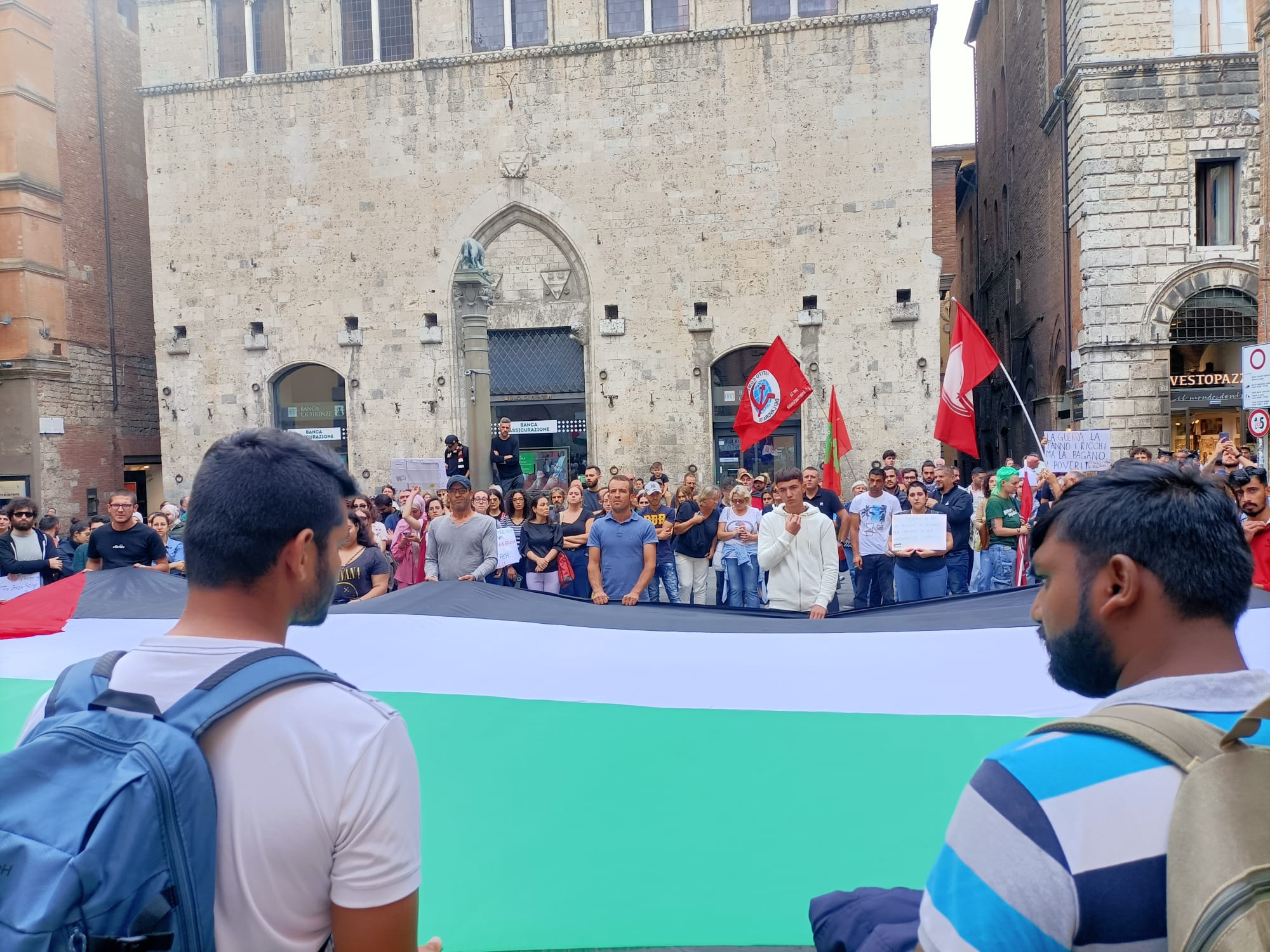 Si è svolto oggi, domenica 15 ottobre, in Piazza Tolomei, il presidio in solidarietà al popolo palestinese indetto da diverse realtà cittadine. Al grido di “Palestina libera” in duecentocinquanta hanno manifestato in solidarietà e vicinanza con il popolo palestinese.