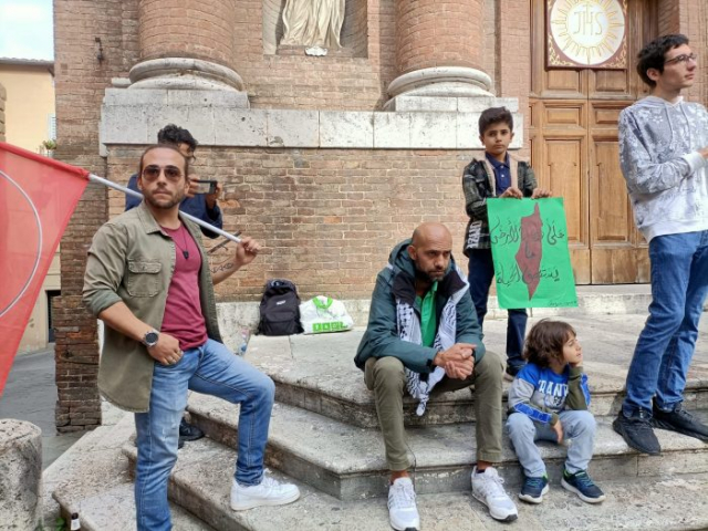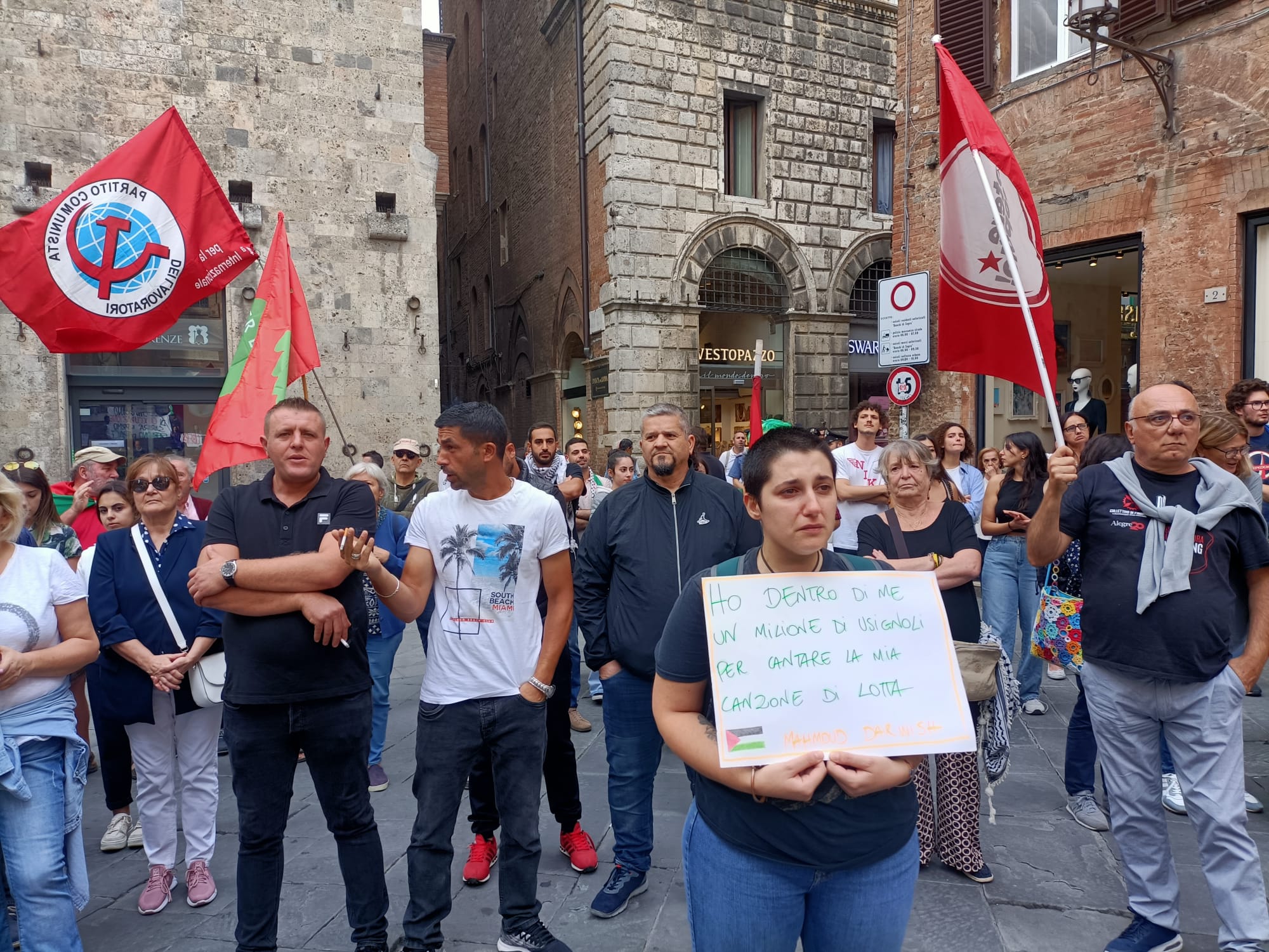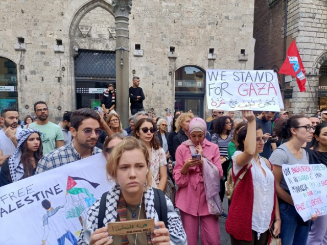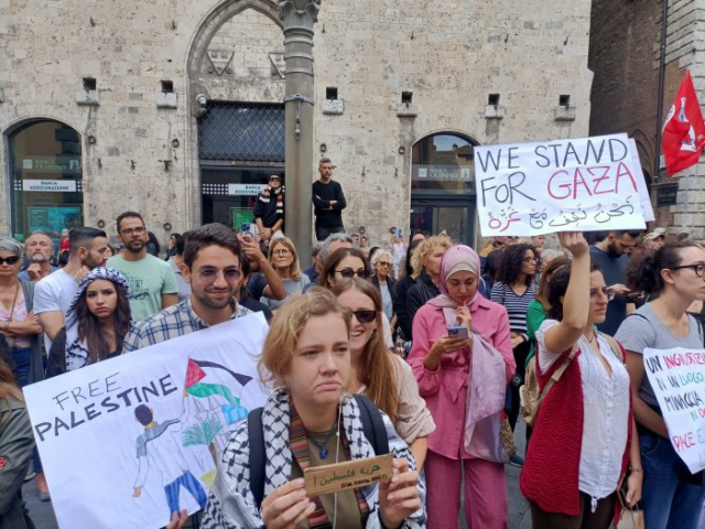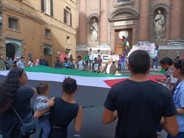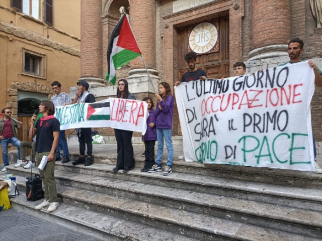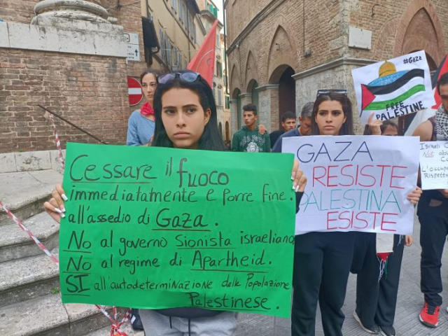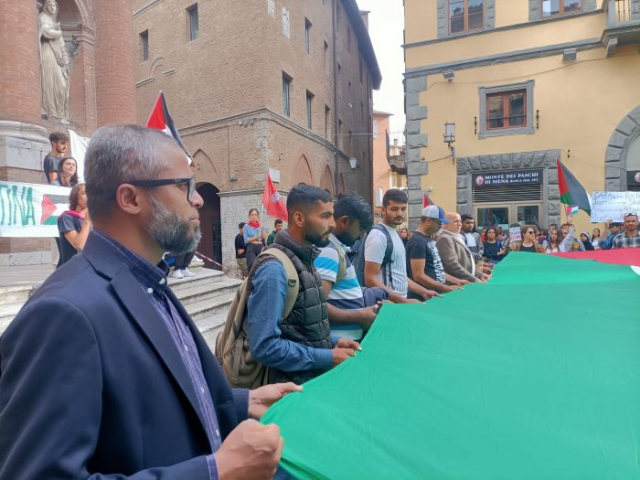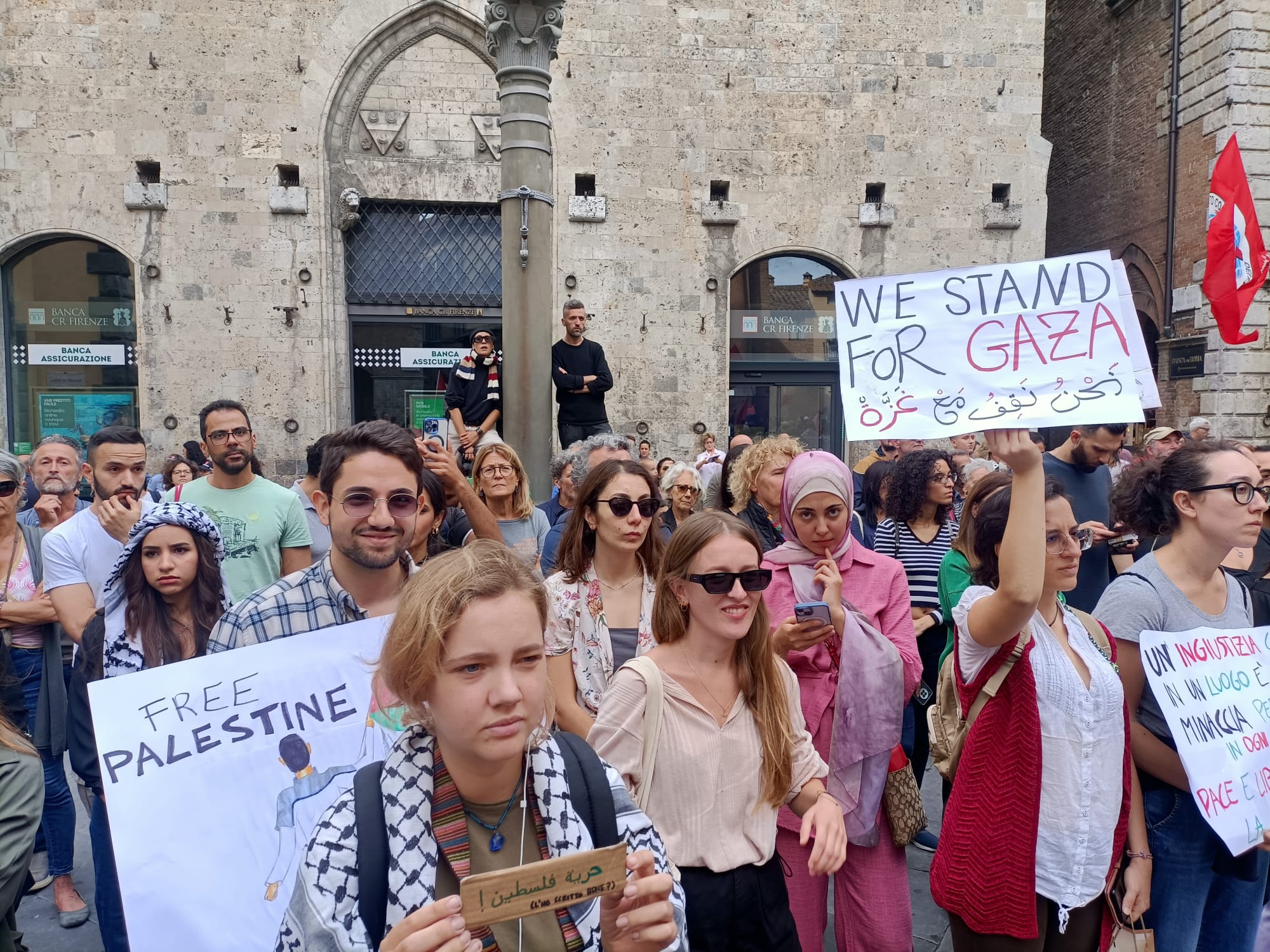 Si è svolto oggi, domenica 15 ottobre, in Piazza Tolomei, il presidio in solidarietà al popolo palestinese indetto da diverse realtà cittadine. Al grido di “Palestina libera” in duecentocinquanta hanno manifestato in solidarietà e vicinanza con il popolo palestinese.