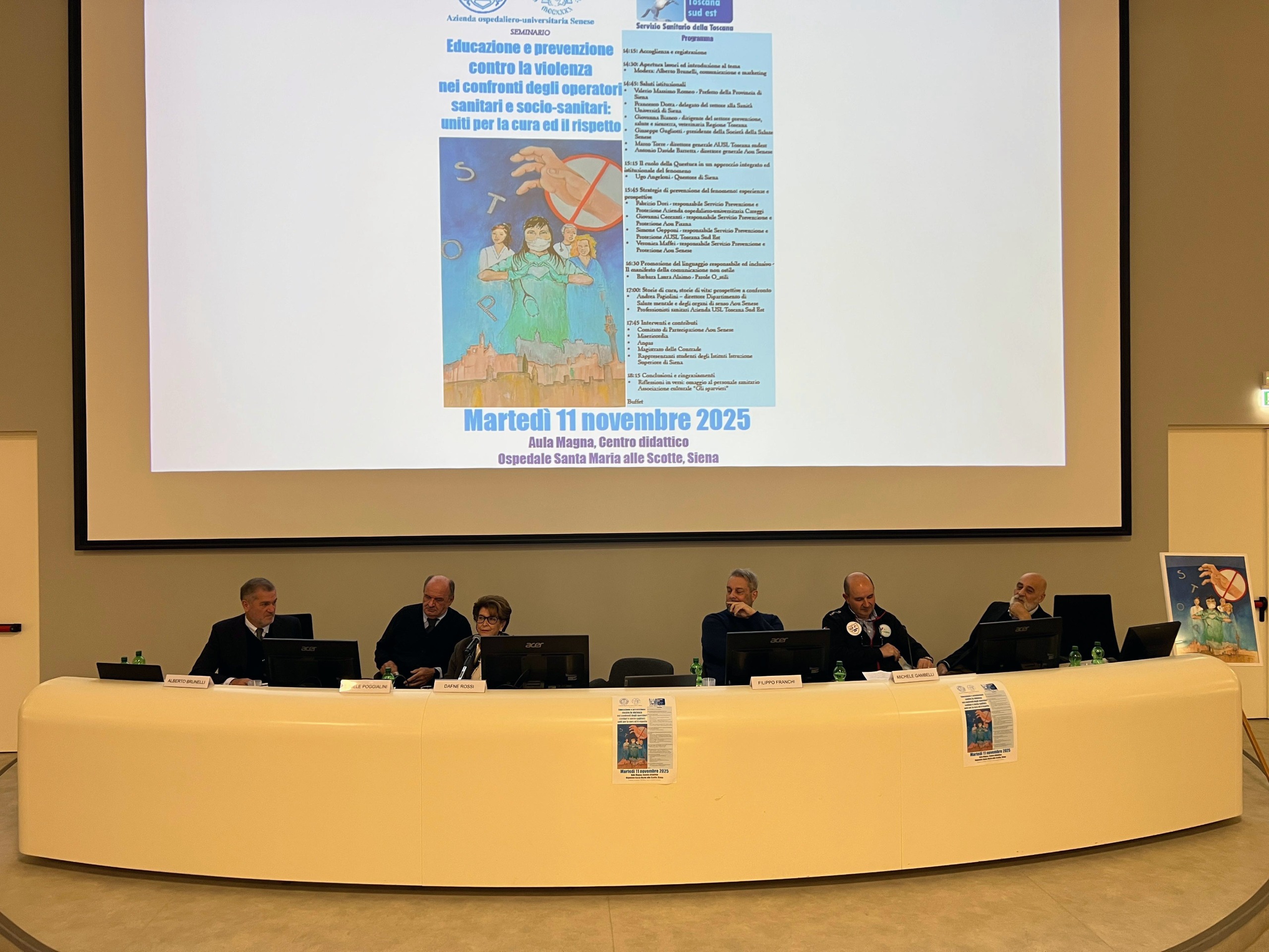 “Educazione e prevenzione contro la violenza nei confronti degli operatori sanitari e socio-sanitari: uniti per la cura ed il rispetto”. È questo il titolo del seminario organizzato congiuntamente da Azienda Ospedaliera Universitaria Senese e Azienda Usl Toscana sud est, per promuovere una cultura del rispetto e della sicurezza verso chi ogni giorno si prende cura degli altri. L’iniziativa, aperta ai professionisti e alla cittadinanza, ha rappresentato un importante momento di confronto e condivisione delle strategie di prevenzione e degli strumenti utili a contrastare gli episodi di violenza che, sempre più spesso, si verificano nei contesti sanitari e socio-sanitari.