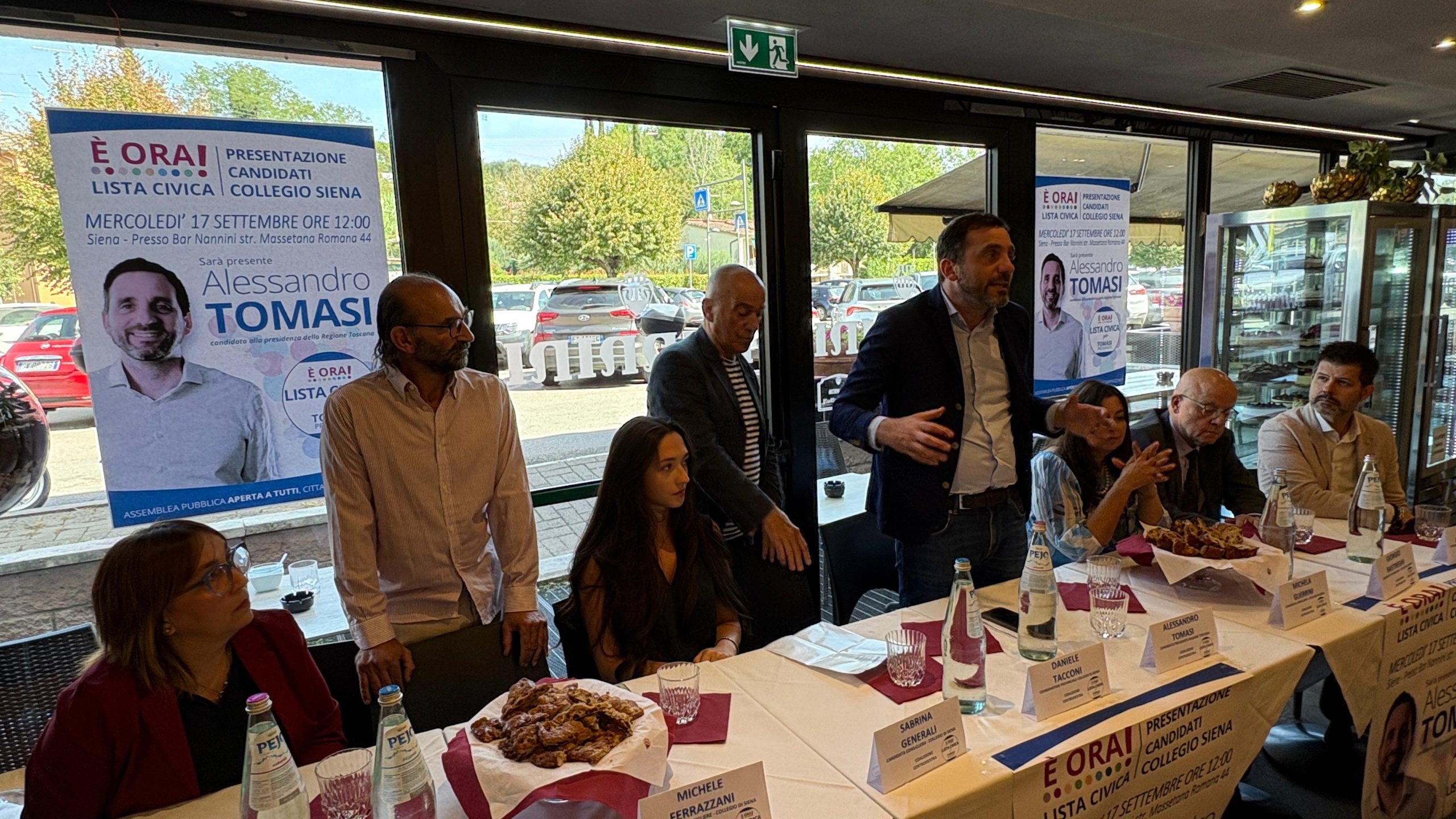 È stata presentata a Siena la lista “È Ora! con Tomasi” con i candidati del collegio provinciale in vista delle prossime elezioni regionali in Toscana. Alla conferenza erano presenti il coordinatore provinciale Daniele Tacconi, il candidato presidente della Regione Alessandro Tomasi e i sei candidati al consiglio regionale: Michela Guerrini (capolista), Simone Lorenzetti, Sabrina Generali, Michele Ferrazzani, Ombretta Mariotti e Giorgio Bastreghi.