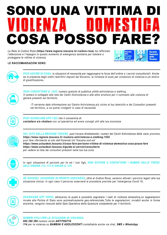 La Rete Codice Rosa ha rafforzato l’impegno in questo momento di emergenza Covid-19 per tutelare e proteggere le vittime di violenza. La violenza domestica continua a esistere, non dobbiamo mai abbassare l’attenzione. Ecco alcune utili raccomandazioni: