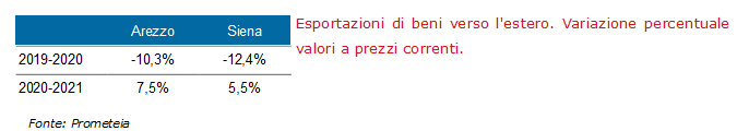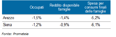 Al momento viene prevista una flessione del 7,9% per la provincia di Arezzo e del 6,1% per quella di Siena, con un probabile parziale recupero nel 2021 (+3,4% per Arezzo e +3,3% per Siena).