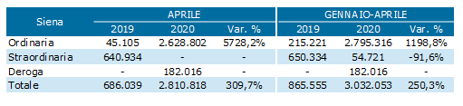 L’andamento del mese di aprile condiziona chiaramente anche i valori cumulati dei primi quattro mesi del 2020: le ore di Cig autorizzate sfiorano i 5 milioni nel territorio aretino, con una crescita del +1777%, e i 3 milioni nel senese, con una crescita del 250,3%.