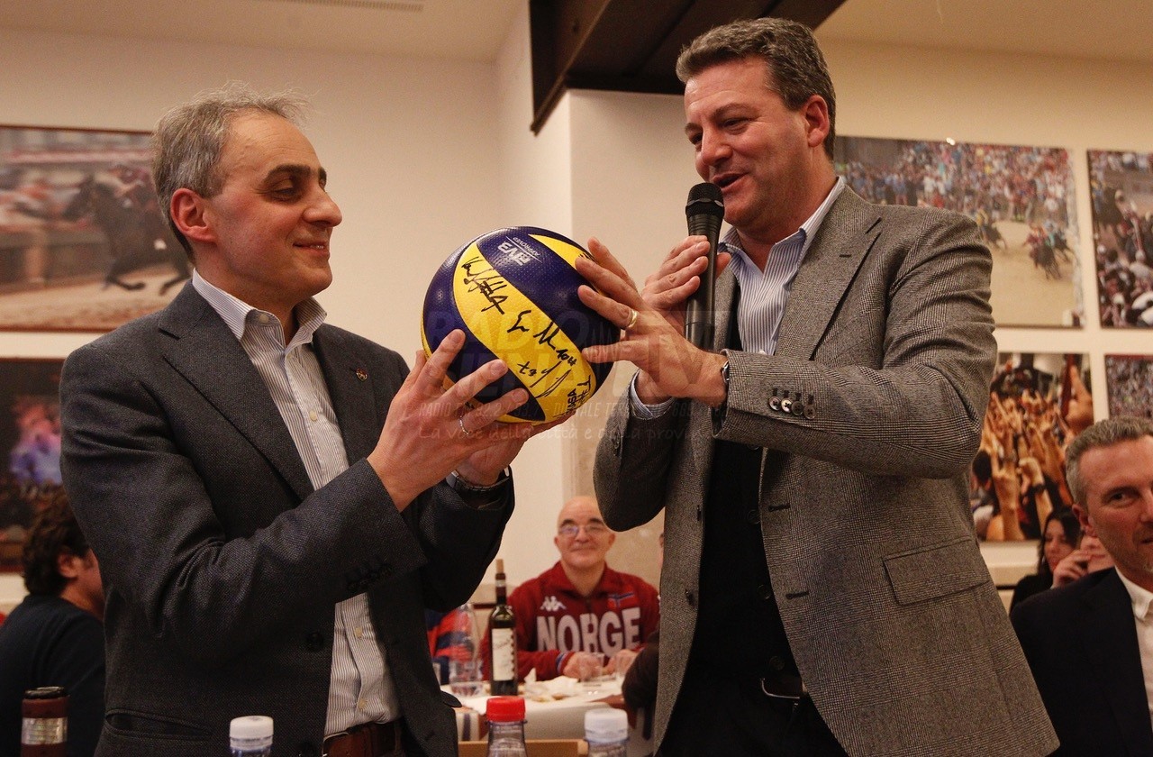 Il vicario generale della contrada della Torre Massimo Bianchi ha portato i saluti del priore Pier Luigi Millozzi e insieme al Presidente di Società Gianluca Peccatori ha fatto i complimenti al Presidente Giammarco Bisogno per i livelli raggiunti con la realtà pallavolistica biancoblu. La cena si è conclusa con uno scambio di doni tra la contrada della Torre e la Emma Villas Siena. La Emma Villas Siena ringrazia la contrada della Torre, la sua dirigenza e tutti i contradaioli per l’ospitalità e per la piacevolissima serata.