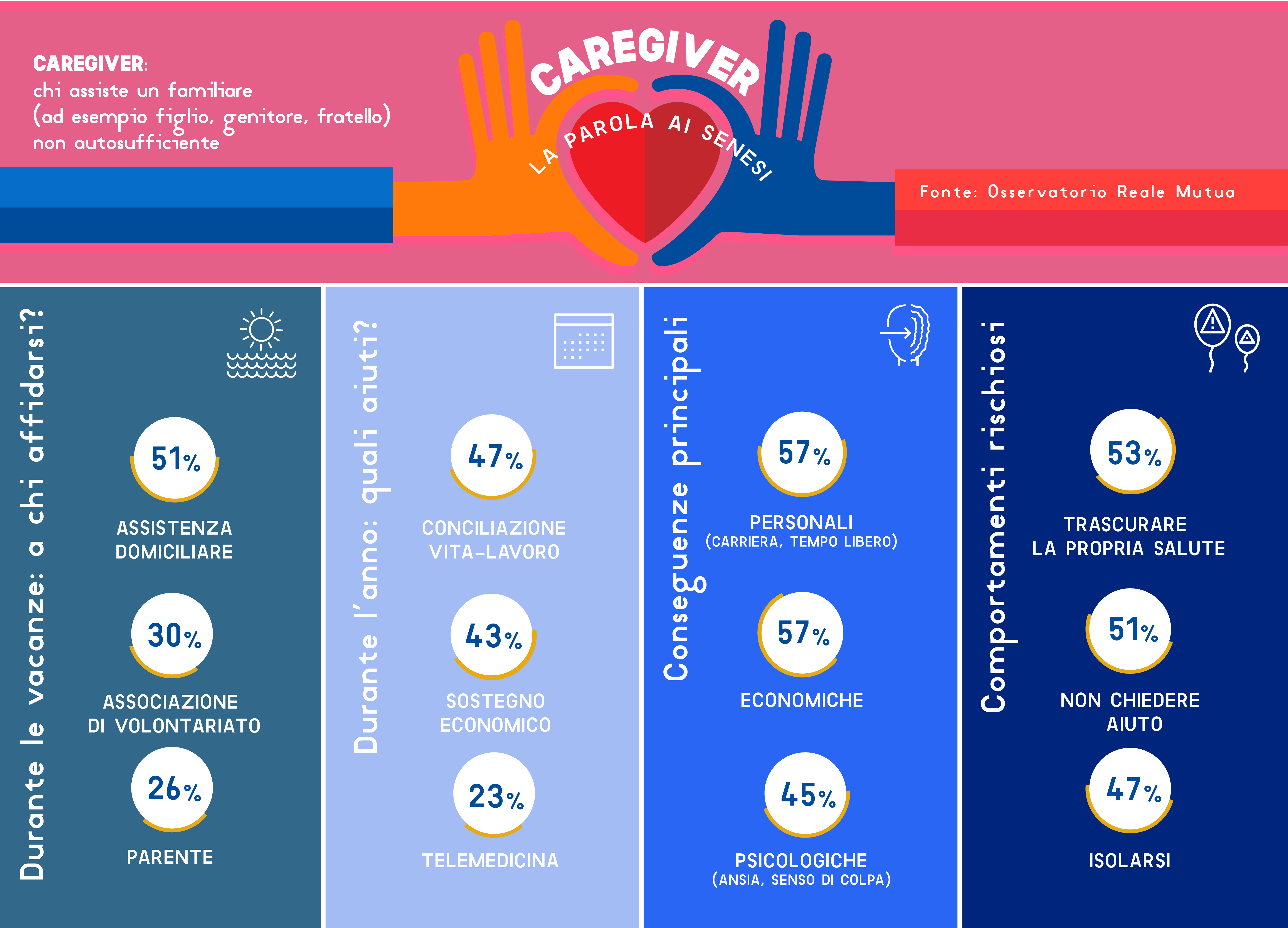 Ma non solo: dedicarsi anima e corpo a questa attività porta spesso a mettere in secondo piano le proprie esigenze, fino ad adottare comportamenti errati e pericolosi. Secondo i senesi, fra i principali rischi c’è quello di trascurare la propria salute (53%), non chiedere aiuto e pensare di poter fare da solo (51%), annullare le relazioni sociali (47%) e non dedicare tempo ai rapporti con gli altri membri della famiglia (30%).
