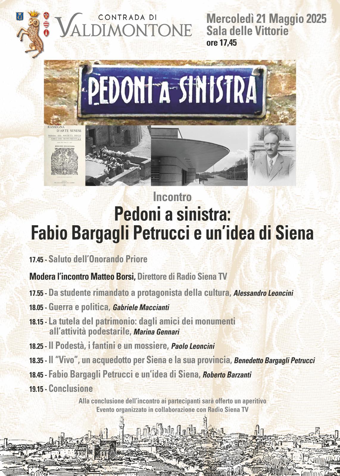 La Contrada di Valdimontone lo ricorda con un incontro che si terrà mercoledì 21 maggio nella Sala delle Vittorie (inizio ore 17.45) che non ha l’ambizione di narrare nei dettagli la sua vita, le sue intuizioni, i suoi progetti, le sue realizzazioni e – ovviamente – anche i suoi fallimenti. Questi passaggi – dalla formazione accademica alla convinta partecipazione alla Grande Guerra e alla vita politica, dall’intensa attività nel campo della tutela delle testimonianze artistiche della città a alla gestione del Palio e per così dire alla monumentalizzazione del Corteo Storico, e infine all’attenzione per l’approvvigionamento idrico della città – saranno trattati con rapidi flash da parte di altrettanti studiosi cittadini che si sono dedicati nel corso degli anni allo studio delle sue attività.