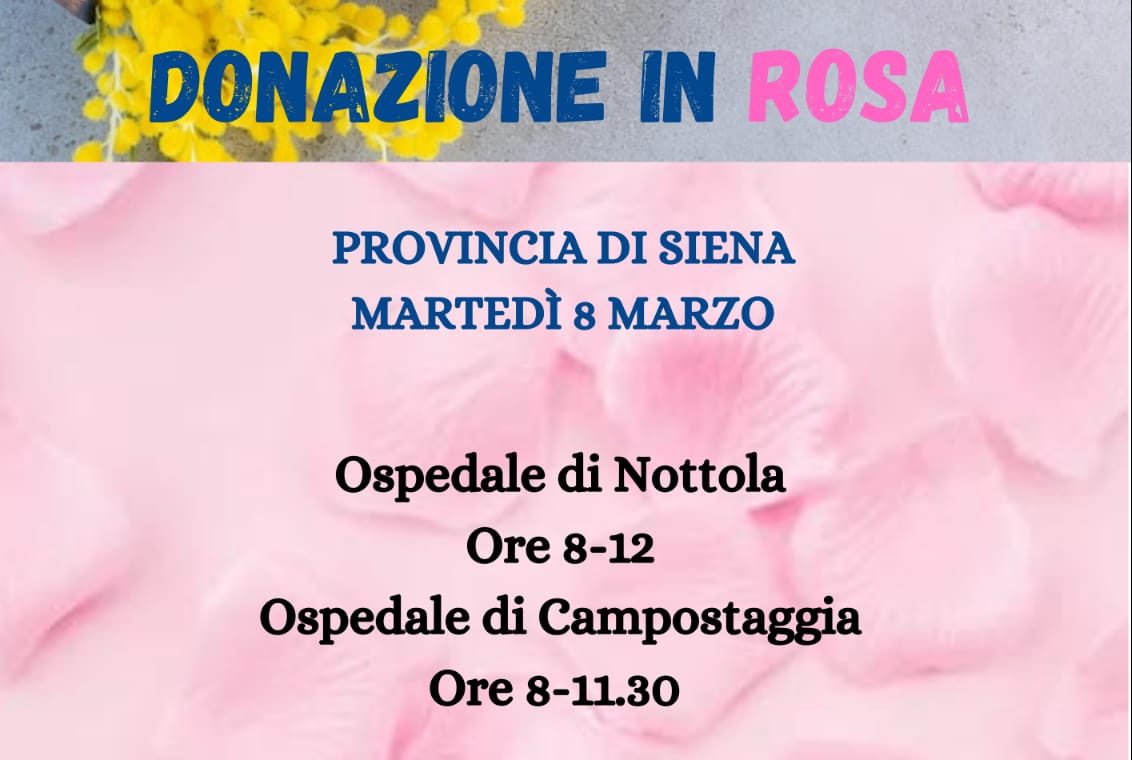 In occasione dell’8 marzo Giornata internazionale della donna, i centri trasfusionali degli ospedali di Campostaggia e di Nottola hanno aderito a “Donazione in rosa”, un’iniziativa speciale di donazione del sangue condiviso con le associazioni dei donatori. A Campostaggia il servizio trasfusionale sarà aperto dalle 8 alle 11.30, mentre a Nottola dalle 8 alle 12.