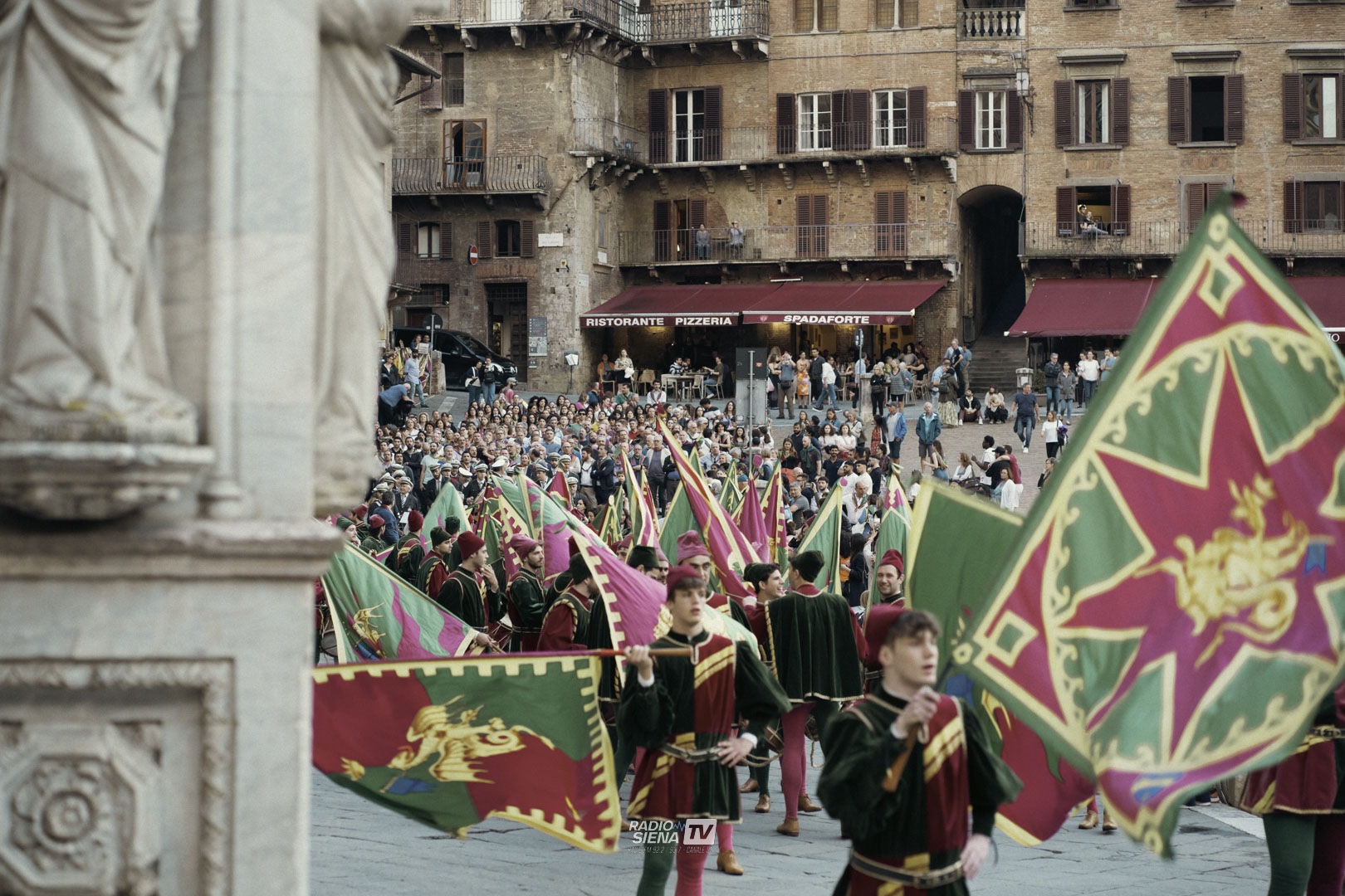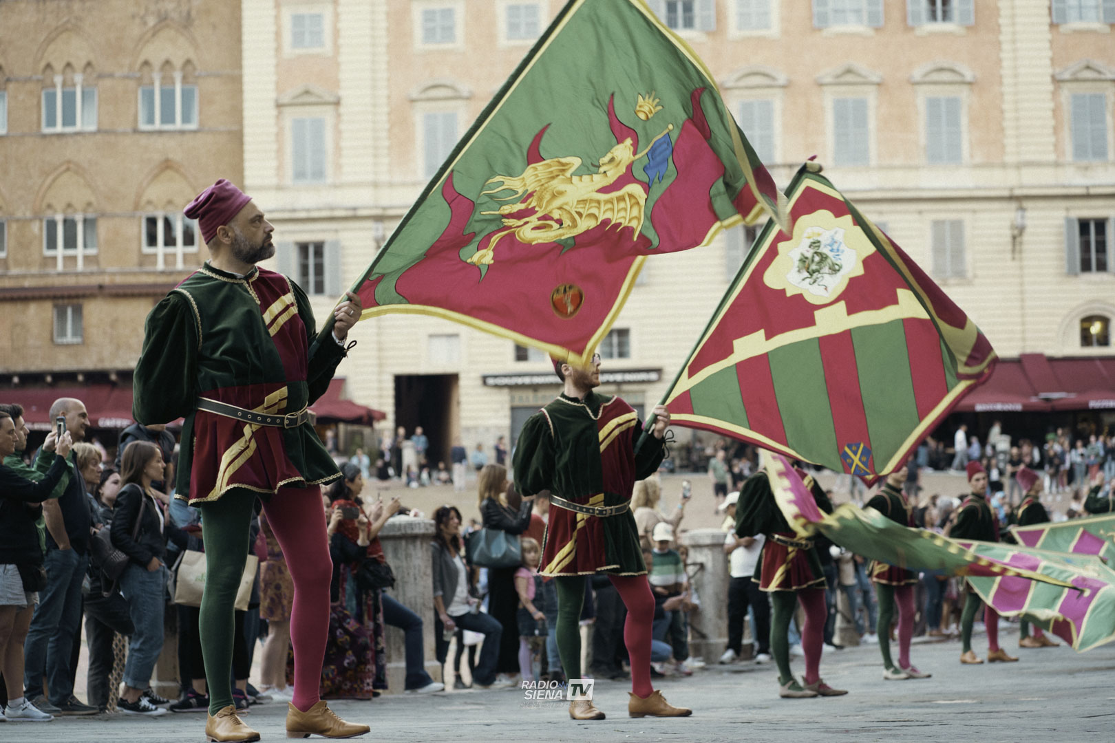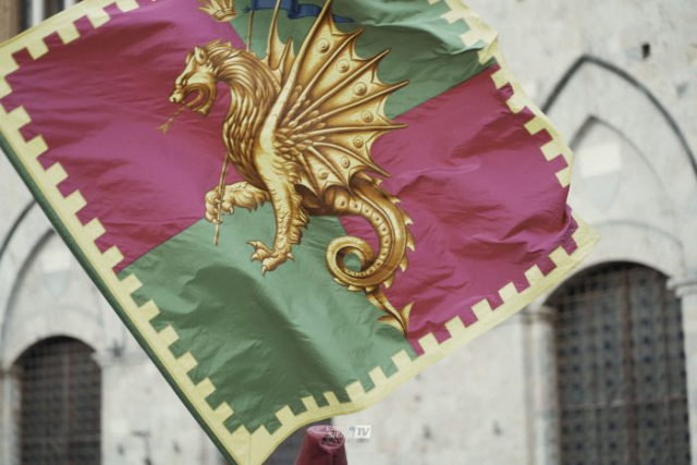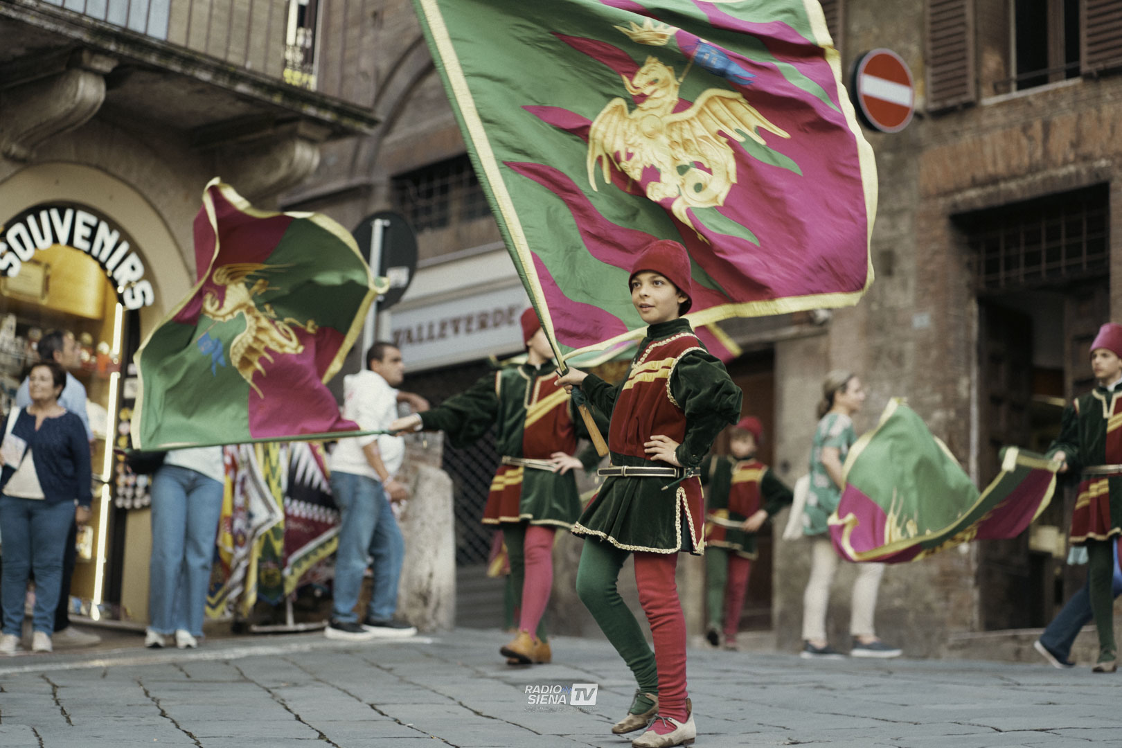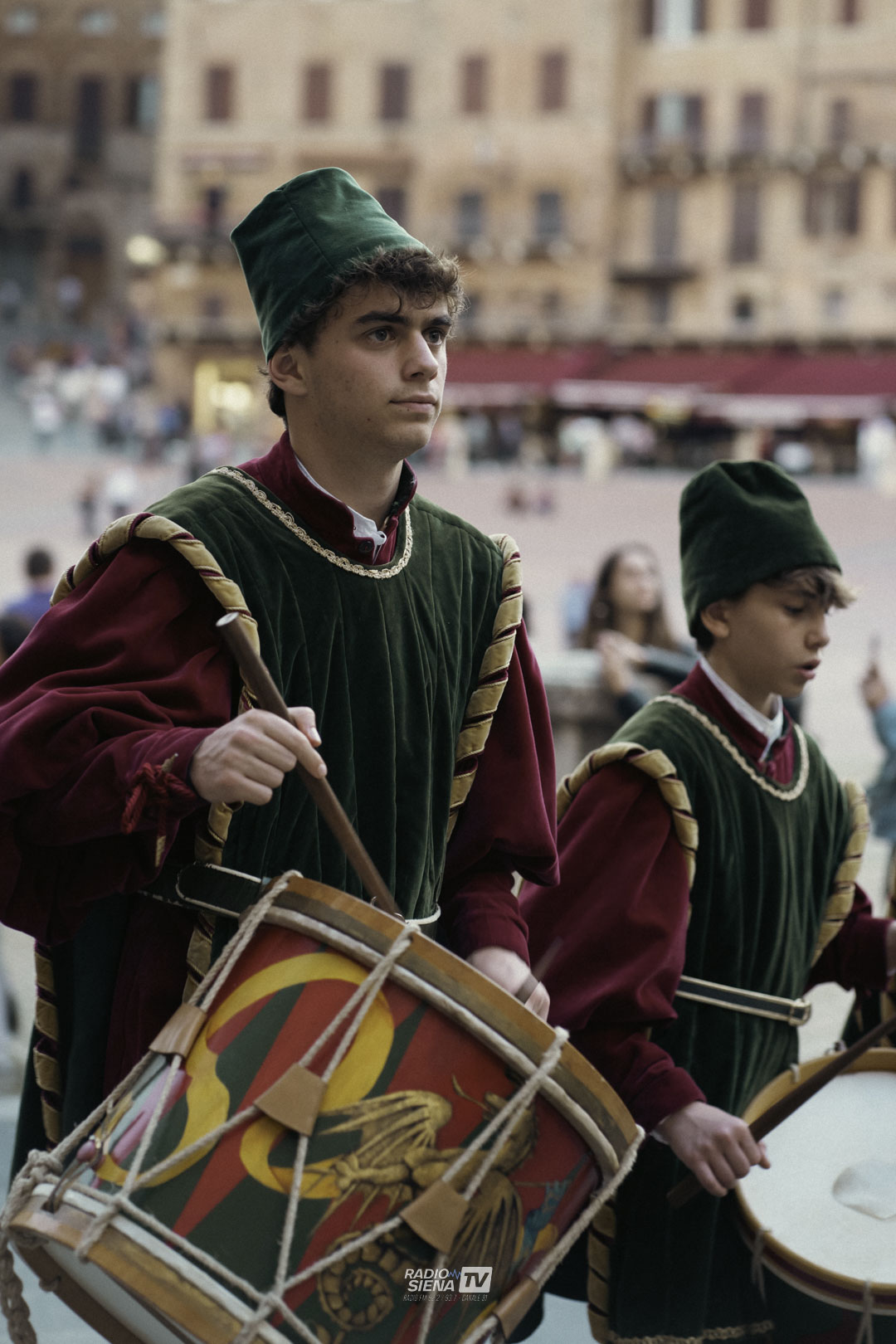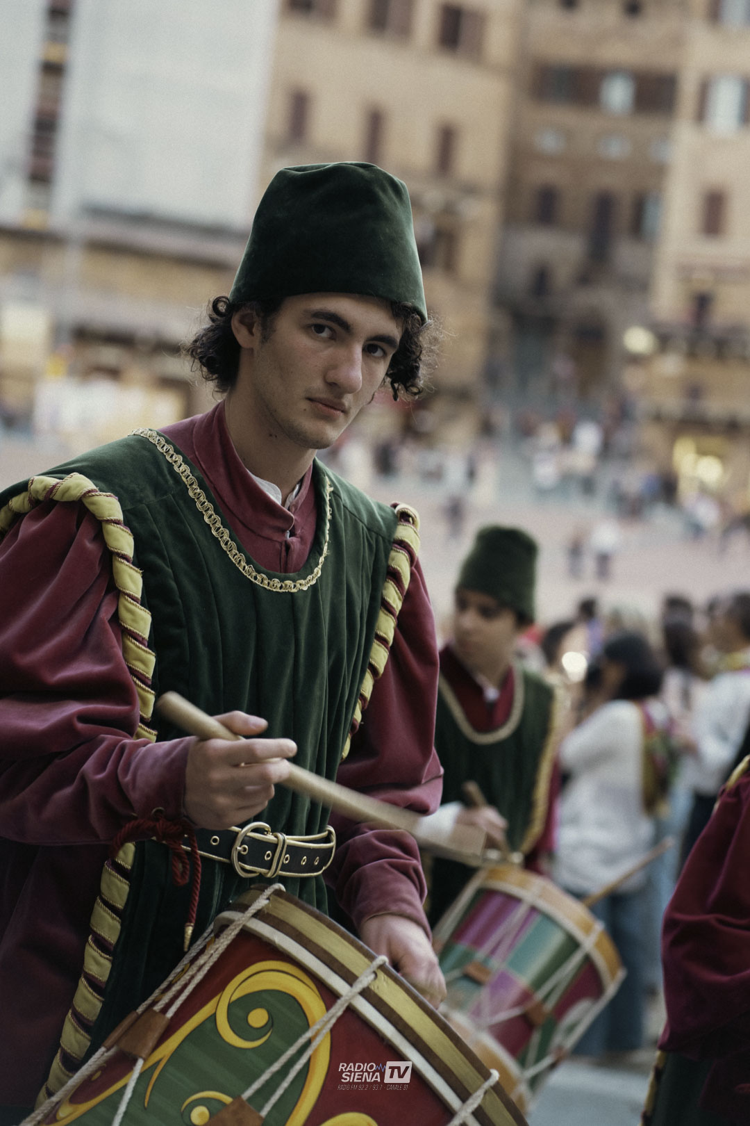Le bandiere e i tamburi della contrada del Drago hanno invaso la città in occasione della Festa Titolare che si è celebrata ieri. Nella nostra gallery alcuni scatti della comparsa di Camporegio che, nonostante uno stop causa pioggia, nel tardo pomeriggio è arrivata in Piazza del Campo per poi fare ritorno in contrada.
