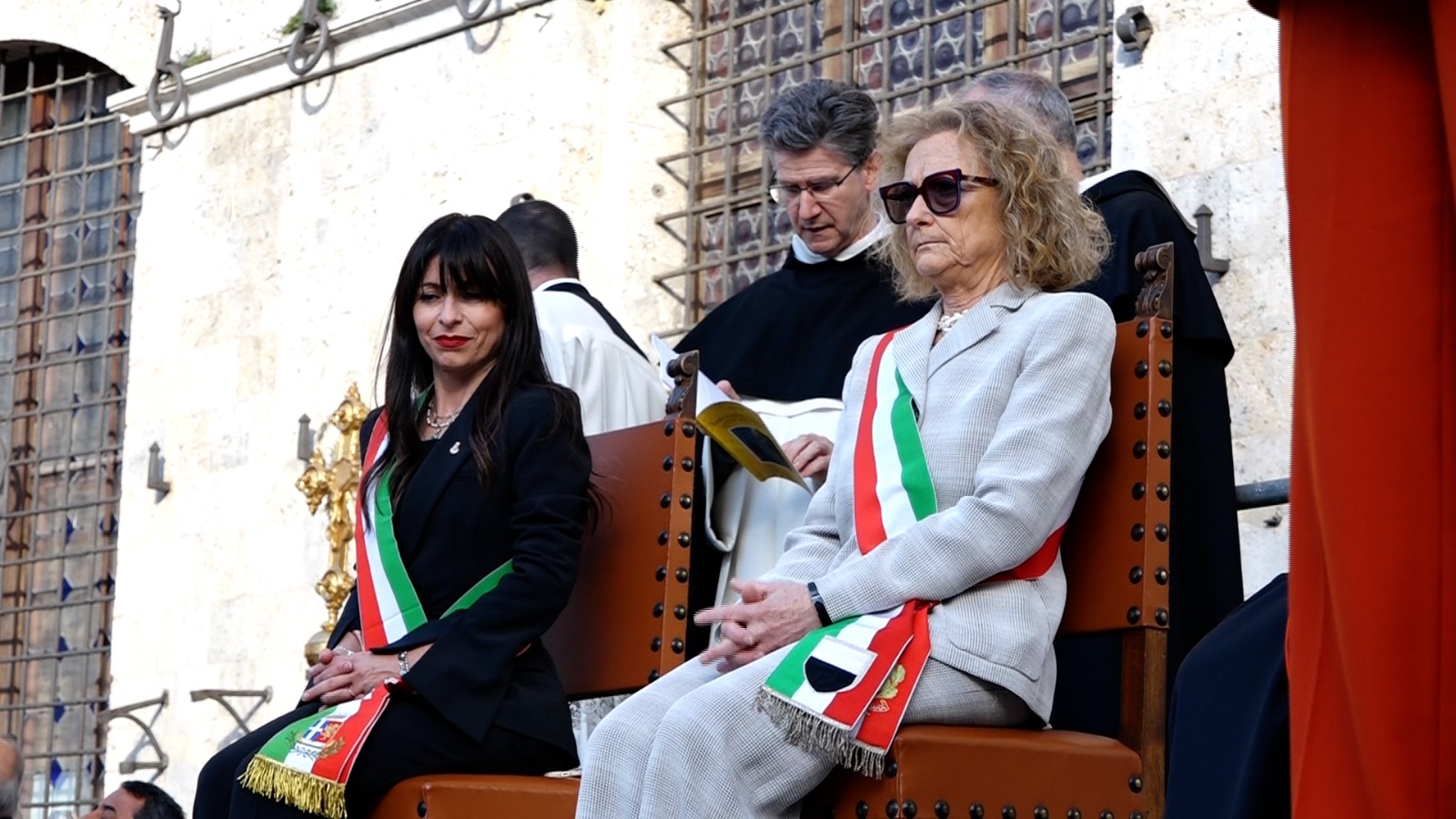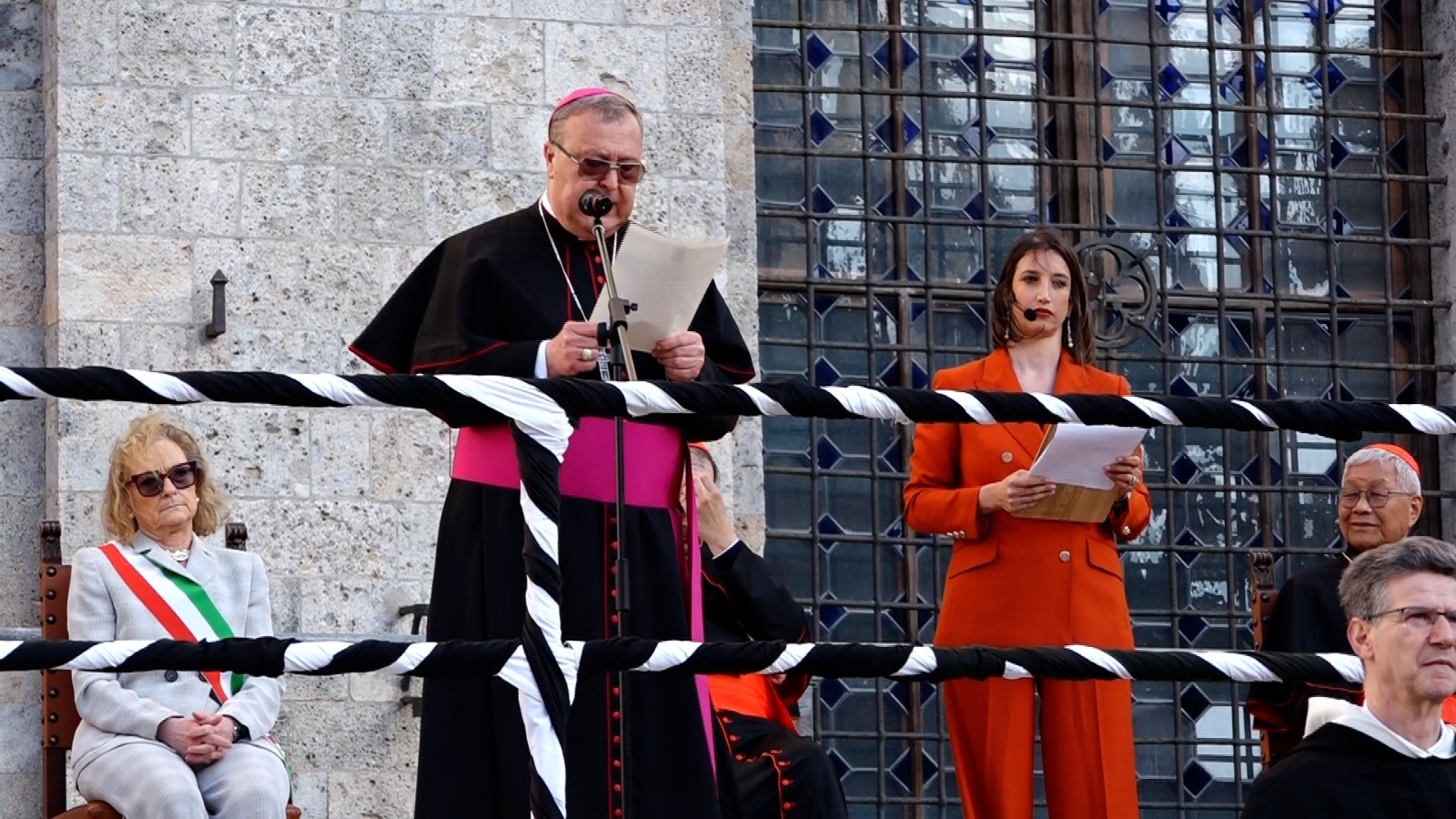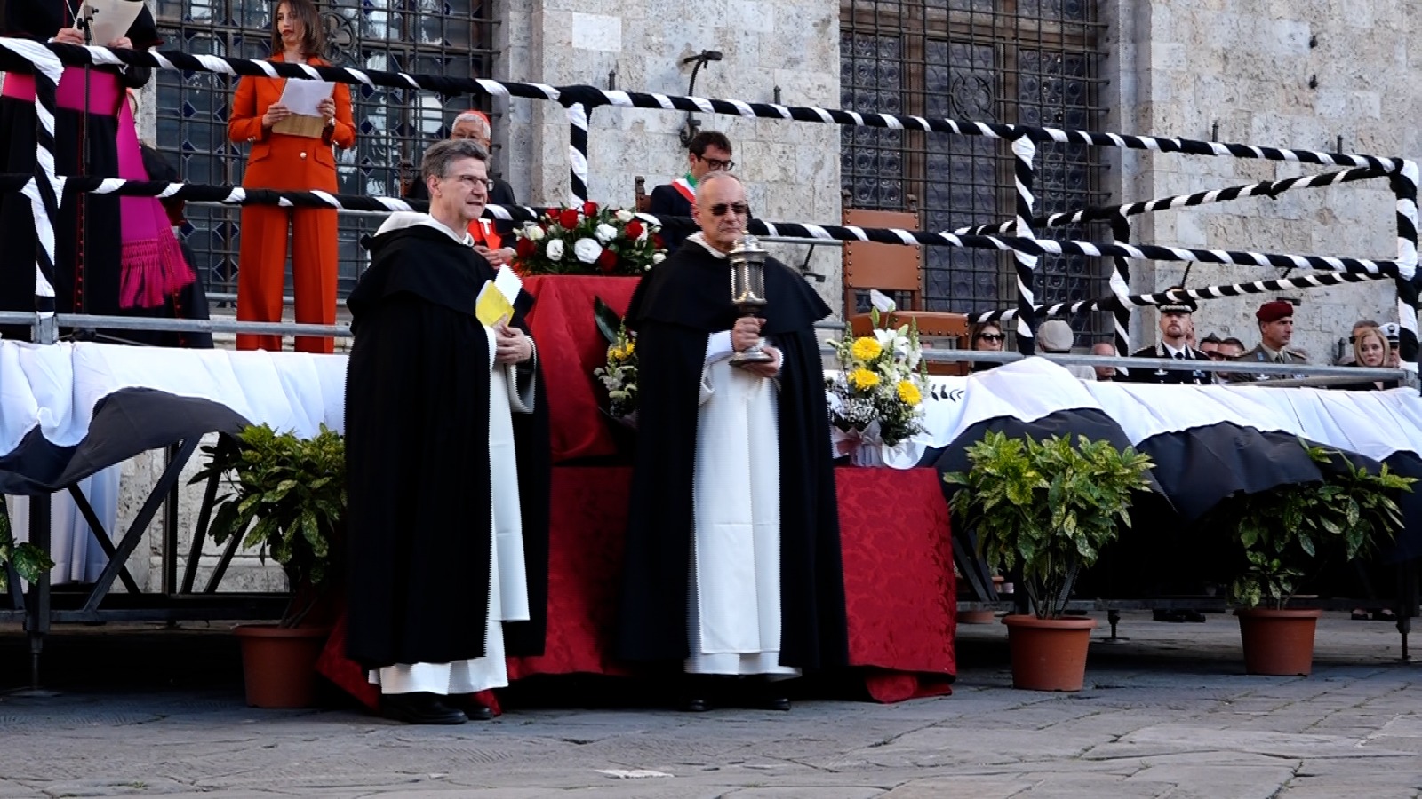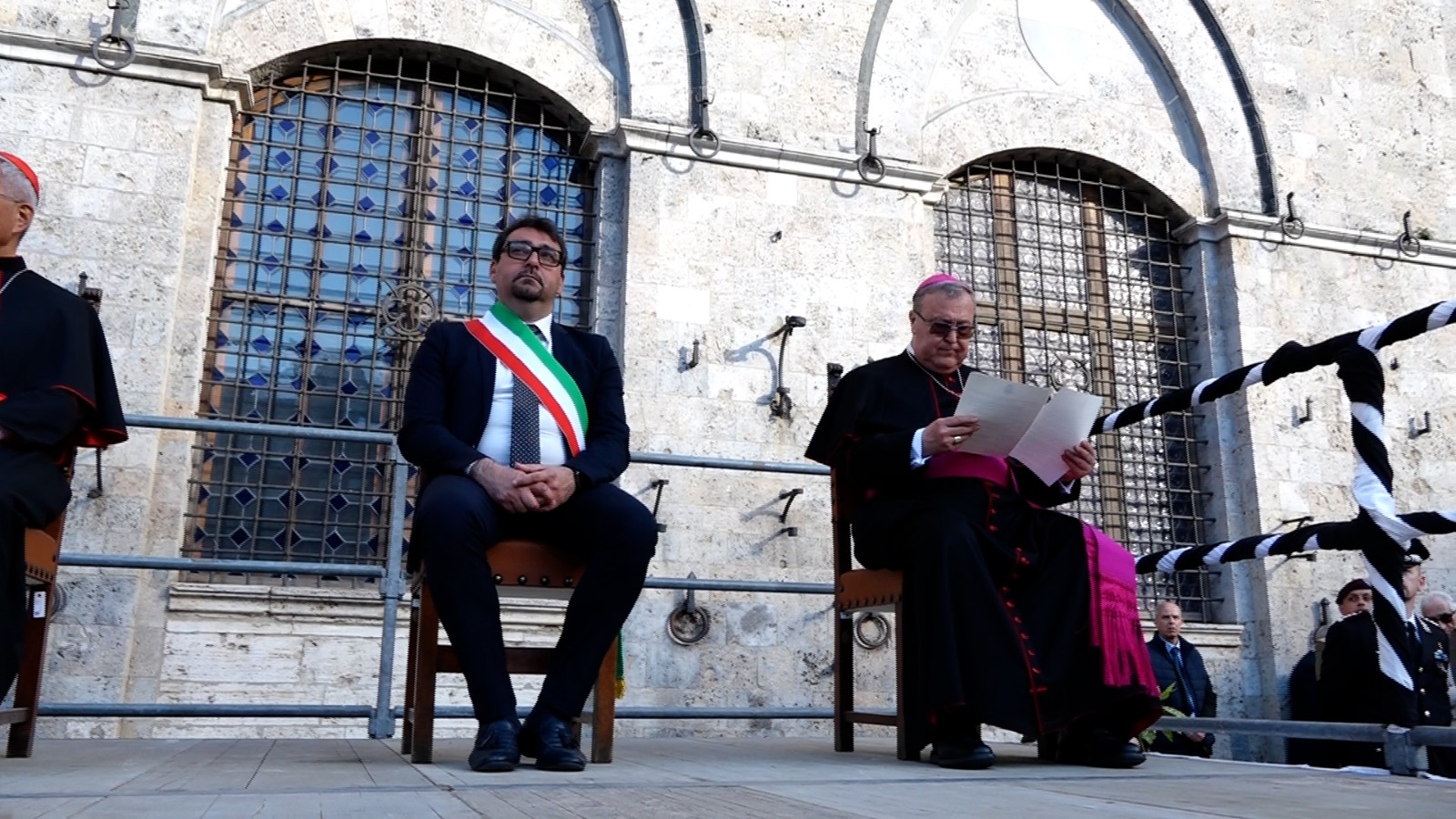 Pomeriggio di celebrazioni per le feste cateriniane che si stanno avviando al termine. Dopo la messa con la “conferma del credo” ai cresimati e cresimandi dell’arcidiocesi presieduta da monsignor Lorenzo Leuzzi, vescovo di Teramo, e concelebrata dal cardinale Augusto Paolo Lojudice, arcivescovo di Siena, nella basilica di San Domenico la celebrazione si è spostata in Piazza del Campo dove hanno parlato Lojudice e Leuzzi, il sindaco Nicoletta Fabio, e Stefania Proietti, sindaco di Assisi. Quindi la benedizione con la reliquia della Santa alla città, all’Arcidiocesi, all’Italia e all’Europa e la sbandierata finale delle contrade.