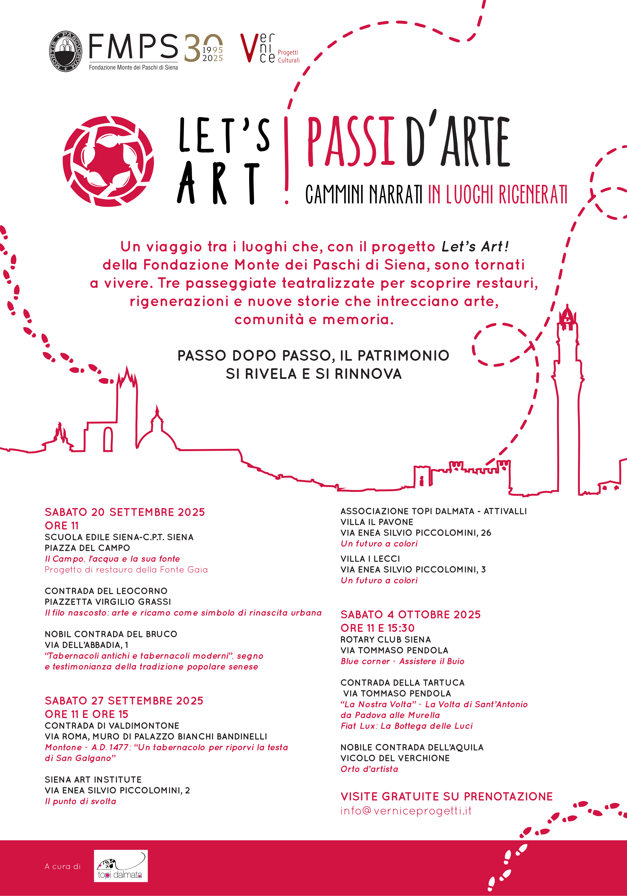 “Ruolo delle Fondazioni è anche quello di far crescere le organizzazioni culturali non profit nel proprio territorio di riferimento. – afferma Carlo Rossi, presidente della Fondazione Mps – Siamo particolarmente soddisfatti del successo riscosso dall’avviso Let’s Art! che, nel corso degli anni, ha sostenuto numerosi progetti finalizzati alla conservazione, rigenerazione urbana, restauro e preservazione del patrimonio storico artistico e architettonico del territorio della provincia di Siena, ma che ha anche favorito l’affiancamento e la formazione alla raccolta fondi. Questa iniziativa di passeggiate teatralizzate, realizzata in collaborazione con Vernice Progetti Culturali e Topi Dalmata, vuole dare l’opportunità alla comunità di condividere insieme a noi il risultato di alcune progettualità compiute fino ad oggi.”