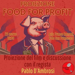 Il dibattutissimo “Food for profit” della giornalista Giulia Innocenzi e Pablo D’Ambrosi approda a Siena. Martedì 26 marzo alle ore 16, su iniziativa di Cravos Siena, il documentario di indagine e denuncia sull’industria alimentare della carne fa tappa non al cinema ma al Polo San Francesco, sede dei dipartimenti di economia (Aula Franco Romani). Dopo la proiezione il regista Pablo D’Ambrosi, parlerà della realizzazione del film e risponderà alle domande del pubblico. Presentato in anteprima al Parlamento europeo giovedì 22 febbraio e proiettato due giorni fa a Montecitorio grazie alla deputata di Europa Verde Eleonora Evi, si trova da lunedì 18 febbraio al quarto posto della top 10 del box office giornaliero, con la media di incassi per sala più alta del momento.