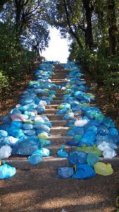 Le sculture graviteranno intorno ad una grande cascata, composta da sacchetti della spazzatura di colore BLU, realizzata sulla scalinata centrale degli Horti Leonini, opera site specific delle artiste Chiara Bigazzi e Chiara Manetti, del corso di Scenografia dell’Accademia di Belle Arti di Carrara.