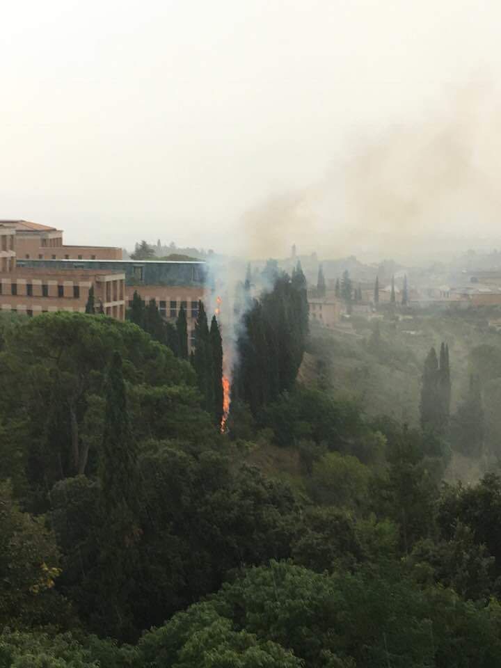 Da pochi minuti è scoppiato un incendio tra gli alberi dietro il complesso universitario in via Mattioli, vicino porta Tufi, all’altezza dell’orto botanico.