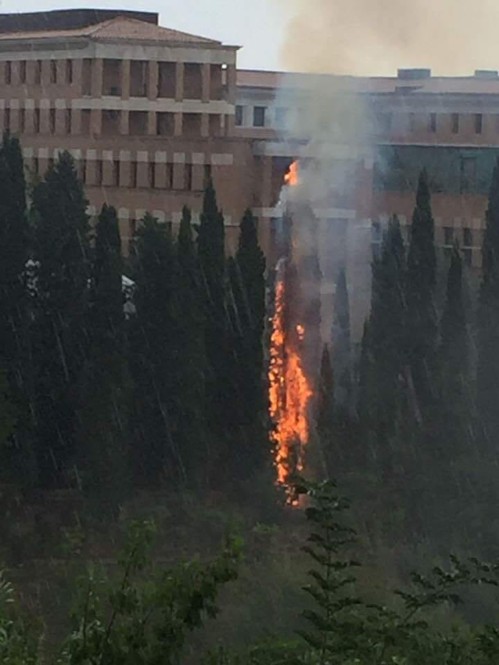Un fulmine si è infatti abbattuto su un albero provocando il rogo. Avvertiti i vigili del fuoco che stanno per intervenire.