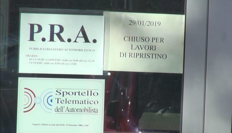 Il Pubblico Registo Automobilistico, situato in viale Vittorio Veneto proprio accanto all’ACI, è ancora chiuso per ripristino, come si legge nel cartello ben visibile all’ingresso, a causa del furto subito.