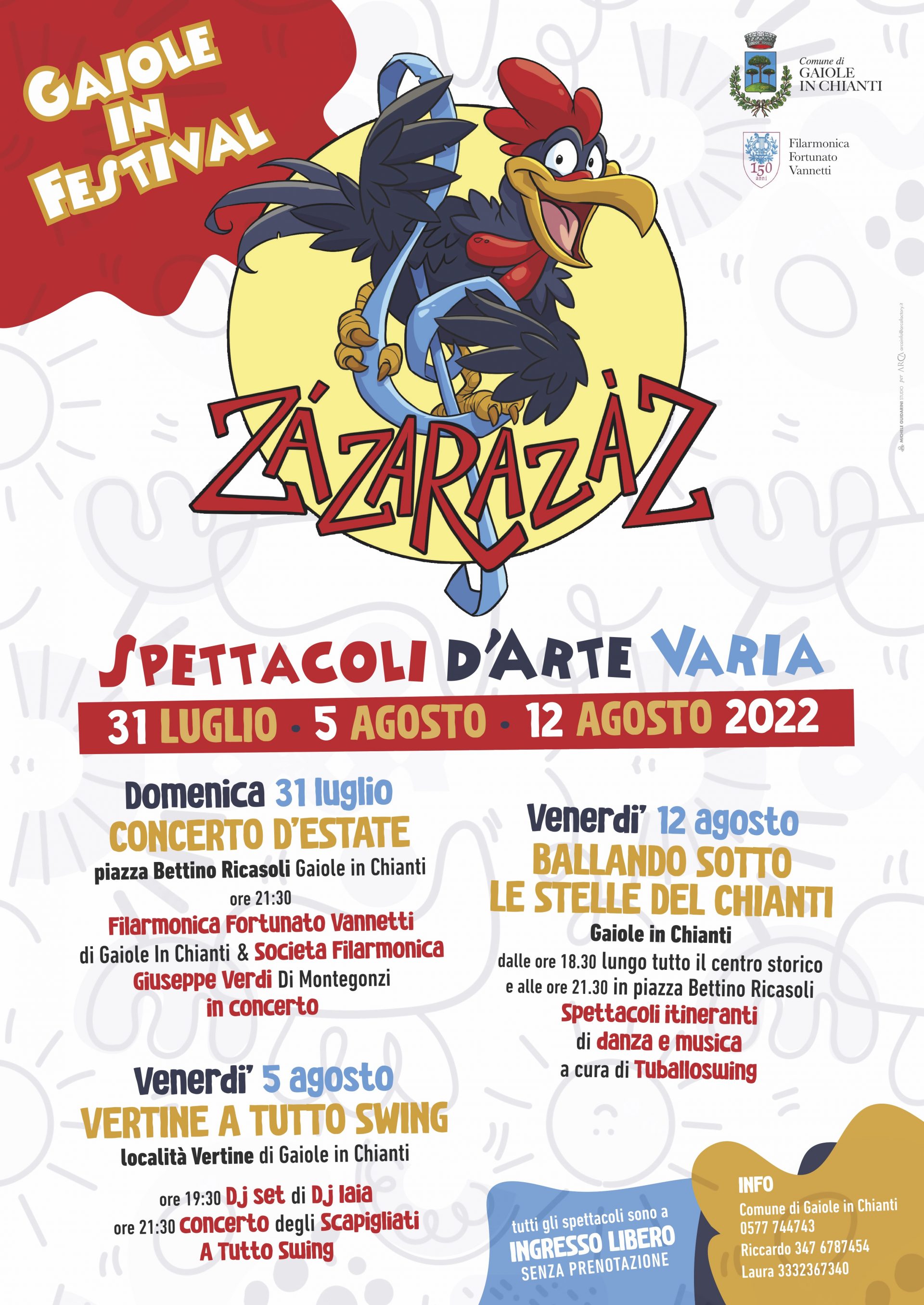 Apre domenica 31 luglio, alle 21 e 30, con il concerto d’estate a Gaiole in Chianti, in piazza Bettino Ricasoli, la prima edizione del Festival ZÁZARAZÀZ organizzato dalla società Filarmonica Fortunato Vannetti con il sostegno economico del Comune di Gaiole in Chianti.