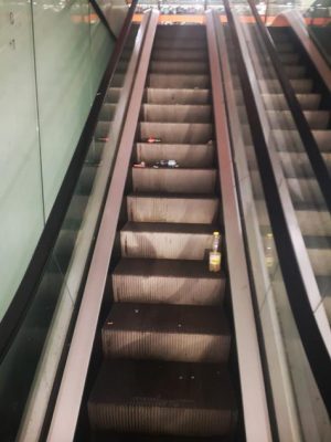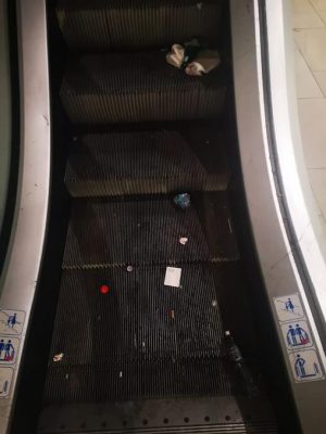 Ieri sono passata dalla galleria Metropolitan, entrando da vicolo della Palla a corda, e sono rimasta sconcertata dalla situazione di degrado: ormai da mesi l’ingresso di Oviesse posto al piano più basso è sbarrato, le scale mobili non funzionano e talvolta non funziona nemmeno l’ascensore. Le scale (non più) mobili sono invase di rifiuti, bottiglie rotte e cocci di vetro, una colonna in cartongesso è sfondata a pugni, con i calcinacci per terra, il pavimento è sporco, i muri coperti di scritte.