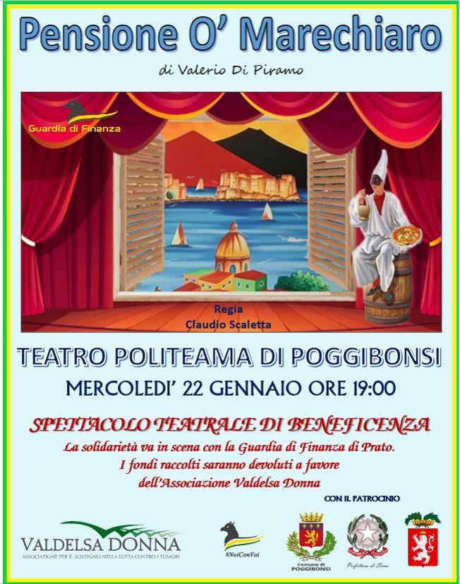 Mercoledì 22 gennaio, alle 19:00, presso il Politeama di Poggibonsi, la compagnia teatrale i “Finanziattori”, composta dalle fiamme gialle del Comando Provinciale di Prato, metterà in scena la commedia “Pensione o’ Marechiaro” per sostenere le attività di Valdelsa Donna con il ricavato della vendita dei biglietti e le donazioni collegate alla serata.