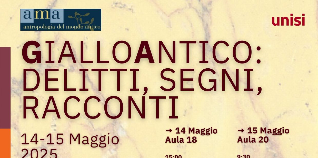 Si terrà a Siena il 14 e 15 maggio il convegno “GialloAntico: delitti, segni, racconti”. L’evento è organizzato dall’Associazione “Antropologia e Mondo antico” in collaborazione con il Centro AMA del Dipartimento di Filologia e Critica delle Letterature Antiche e Moderne (DFCLAM) dell’Università di Siena.