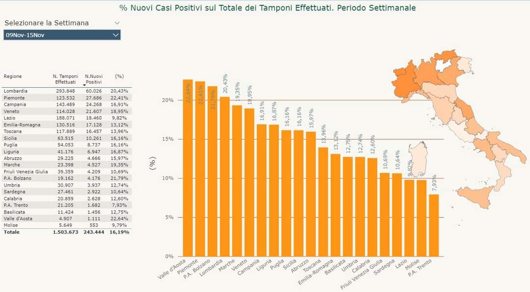 “Leggete questi dati – scrive su Facebook – la percentuale dei nuovi casi positivi sul totale dei tamponi effettuati ci pone al 12º posto in Italia. Sorprende come in regioni gialle e arancioni la percentuale sia ben più alta della nostra. Chi oggi mi vorrebbe vedere subire senza esprimere amarezza e delusione la scelta di classificare rossa la Toscana si legga bene questo grafico”.