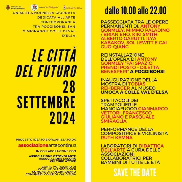 L’intera giornata, tra passeggiate, opere, arti e musica, intende rimarcare fortemente la mission perseguita da Associazione Arte Continua tramite il progetto Le Città del Futuro. Si tratta di un nuovo step, una veste più ampia come prosecuzione di tutte le iniziative promosse nel corso degli anni: l’installazione delle opere permanenti delle nove edizioni di Arte all’Arte; la creazione del piccolo museo UMoCA nel 2001 sotto le arcate del ponte di San Francesco, che ha ospitato la mostra di Ni-Tsai Chin (2001), nel 2005 è stata donata alla città con l’inaugurazione della mostra di Jennifer Wen Ma, segue Kiki Smith (2008) e, dopo il restauro avvenuto nel 2022, le mostre di Marisa e Mario Merz (2022), Mimmo Paladino (2023) e di Loris Cecchini (2024); e ancora, gli incontri sulla sostenibilità ambientale e cura del territorio nati durante il Covid e i convegni seguiti in presenza fino a oggi; le mostre e installazioni di artisti internazionali quali Antony Gormley durante la Biennale di Venezia presso il Negozio Olivetti con Lucio Fontana e Giuseppe Penone al Museo degli Uffizi con un’installazione in Piazza della Signoria; Arte per la Riforestazione alle case popolari nel comune di Prato, con la raccolta fondi per il suo sviluppo duraturo nel tempo; e il progetto di Didattica dell’Arte nelle scuole della Val D’Elsa, per trasmettere alle generazioni future la bellezza dell’arte contemporanea e il rispetto della natura. La continuazione di tutto questo è un atto imperativo quanto rigenerativo. Un ecosistema fatto da opere d’arte e contributi concreti sulla natura, da partecipazione comunitaria e impegno sociale, alla quale Associazione Arte Continua crede e che sostiene fortemente. Oggi come non mai è fondamentale salvaguardare l’ambiente, con le sue bellezze, la sua storia passata e presente, con una visione sul futuro concreta e tangibile attraverso azioni estetiche ed ecologiche. Per noi l’arte è indispensabile e non solo necessaria, per questo abbiamo sviluppato anche i progetti Arte x Vino= Acqua e più di recente Arte per la Riforestazione – Arte come ossigeno per la mente e Alberi come ossigeno per il corpo e viceversa.